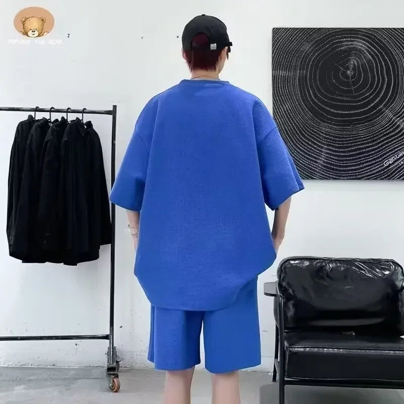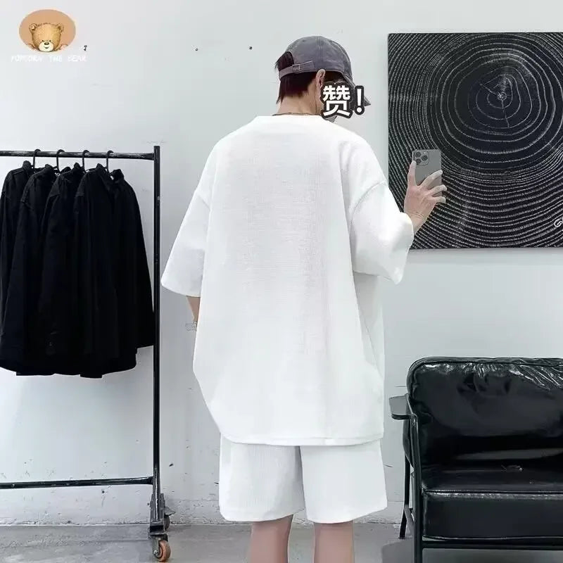 Men's Teddy Bear 3D Embroidered Design Streetwear Hip-Hop Short Sleeve T-Shirt + Drawstring Shorts 2 Piece Set
