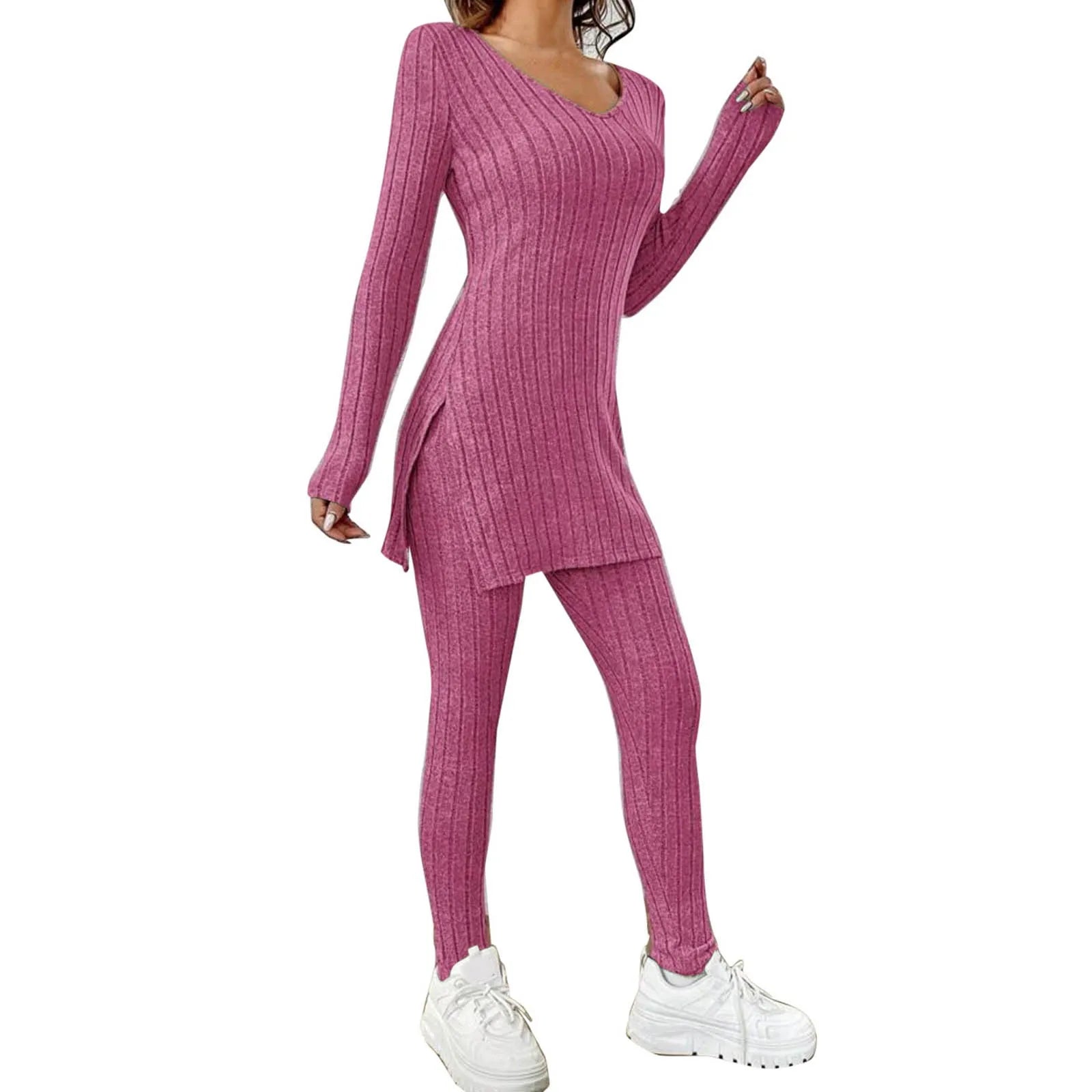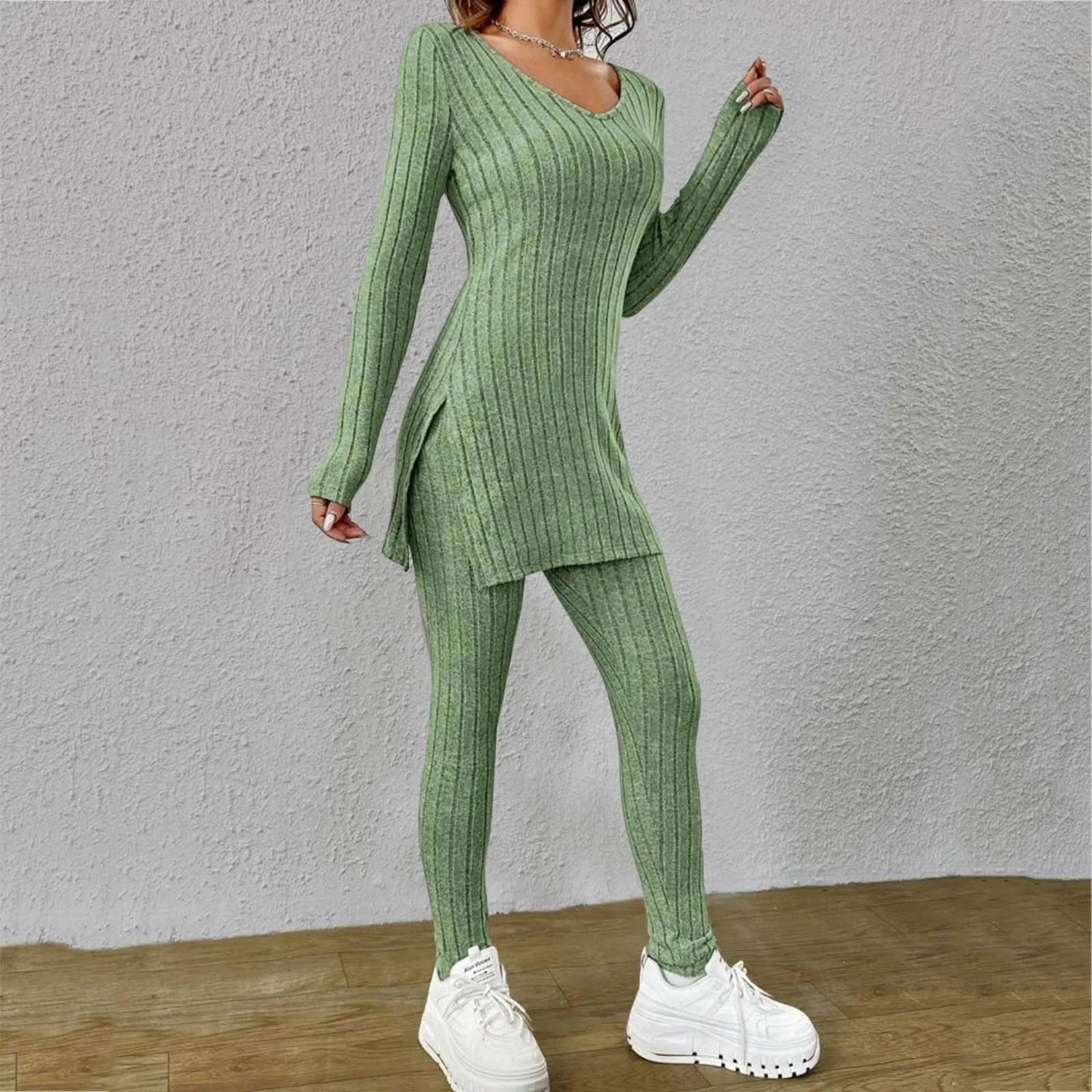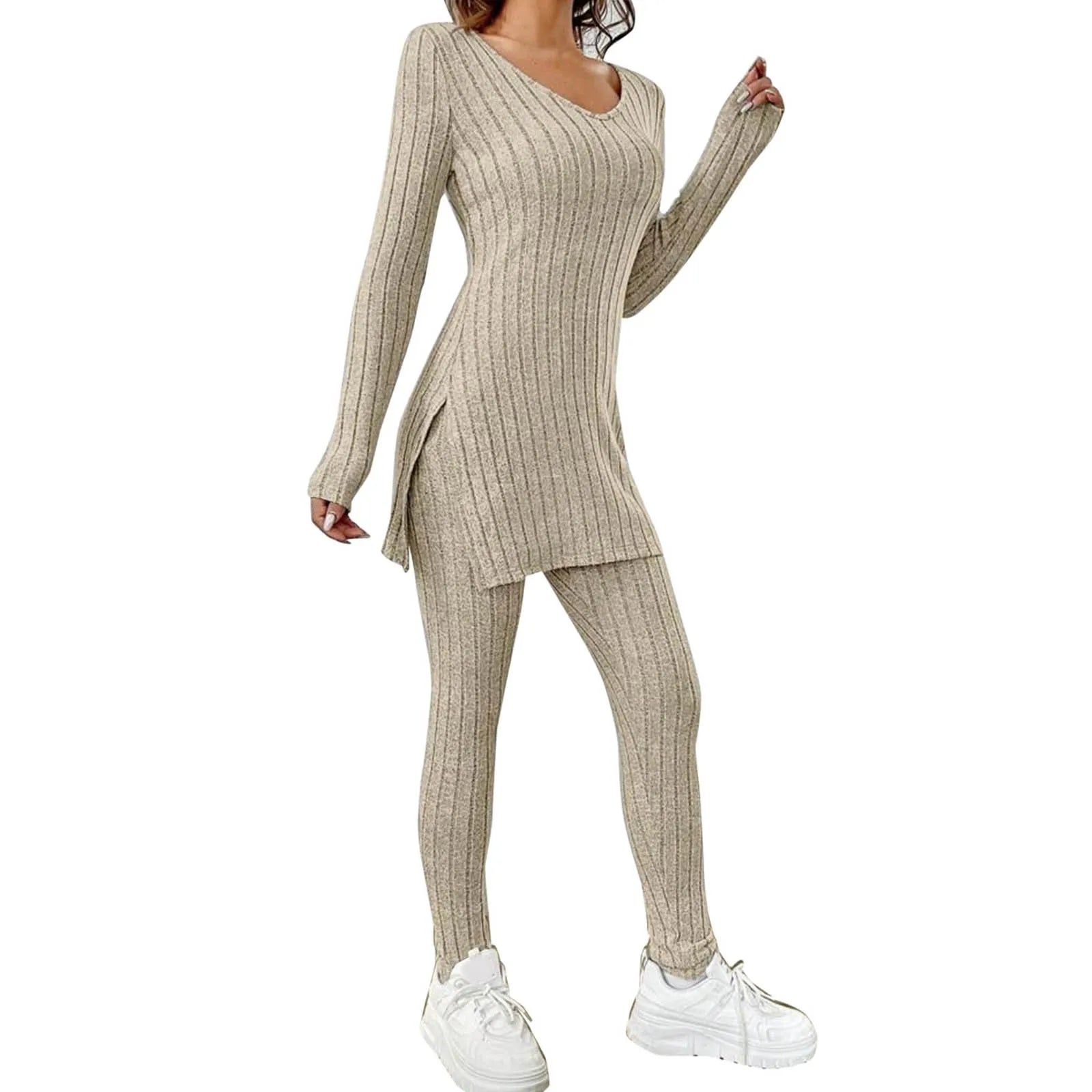 Ribbed Knitted Long Sleeve Women's Tunic Shirt + Leggings 2-Piece Set