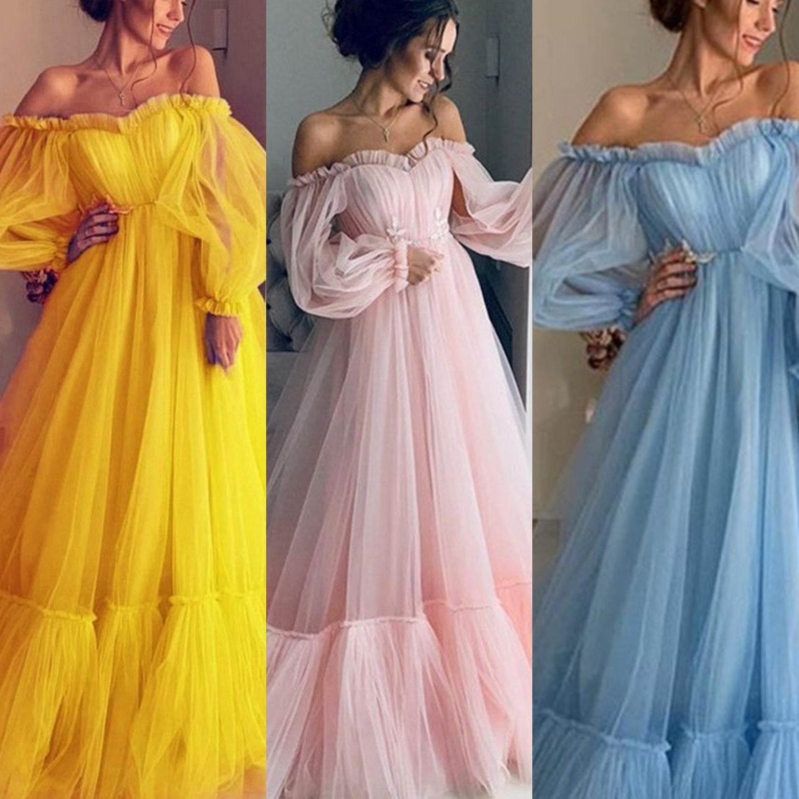 Victorian Oversized Off-the-Shoulder Mesh Sheer Solid Color Long Sleeve Maxi Formal Floor-Length Dress