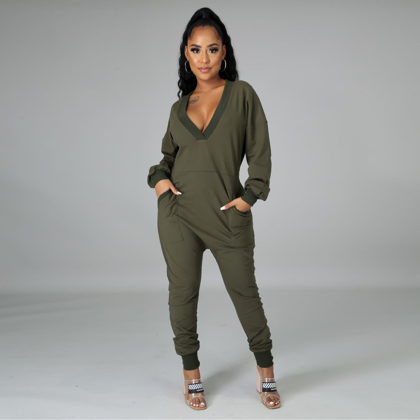 Deep V-Neck Long Sleeve Pocketed Women's Harem Pants Jumpsuit to 3X Plus Size