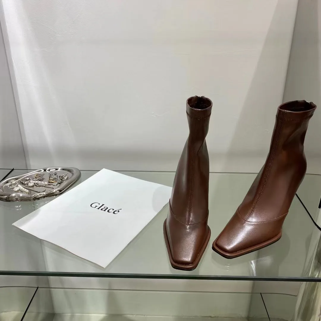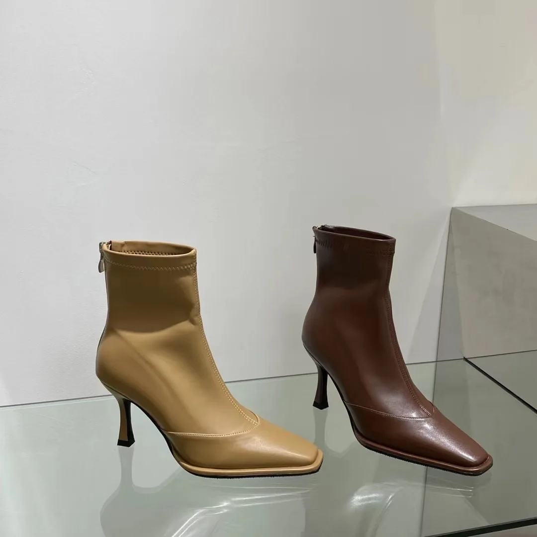 Square Toe Thin Heel Zipper Stretch Ankle Boots