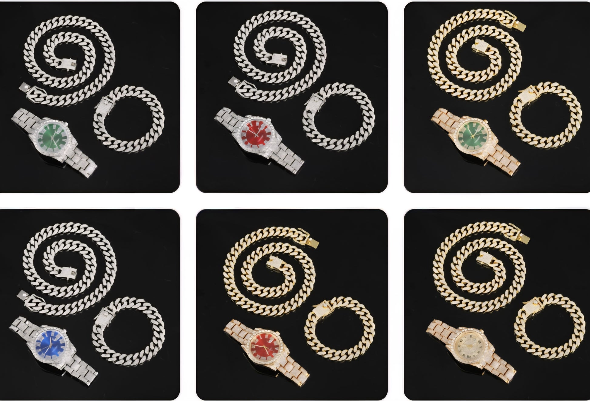 3-Piece Hip Hop/Rock Jewelry Sets: Bling Crystal AAA+ Rhinestone Iced Out Cuban Chain, Colored Watch + Bracelet