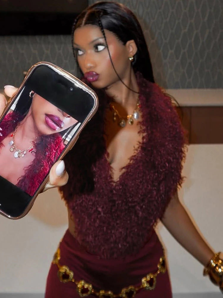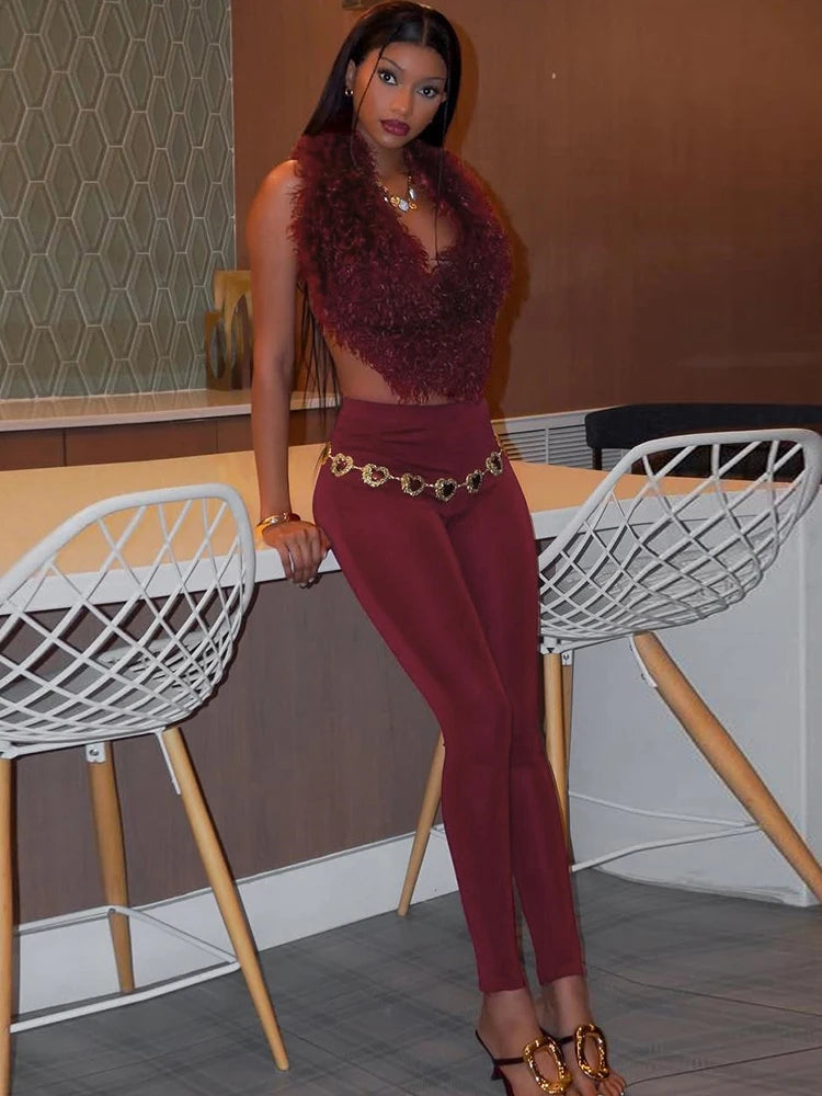 Sleeveless Faux Fur Tassel Lace-Up Halter Women's V-Neck Backless Vest + Elastic Leggings 2-Piece Set