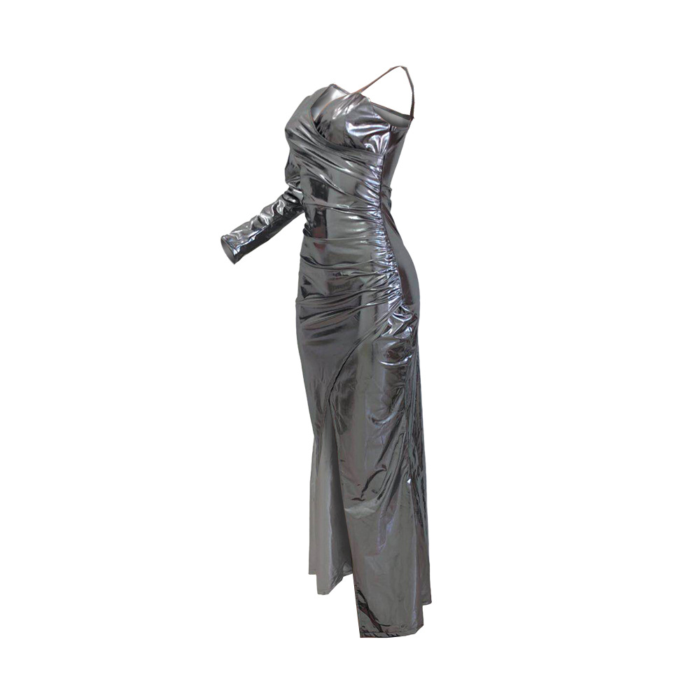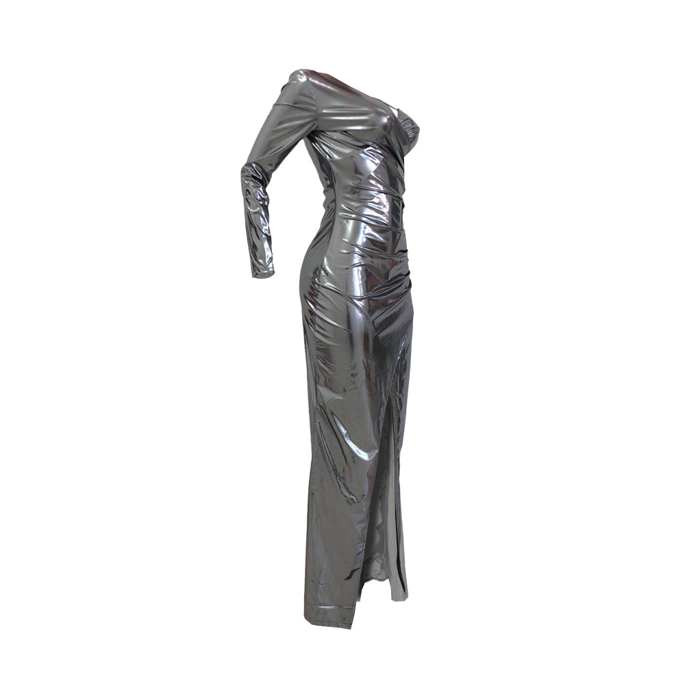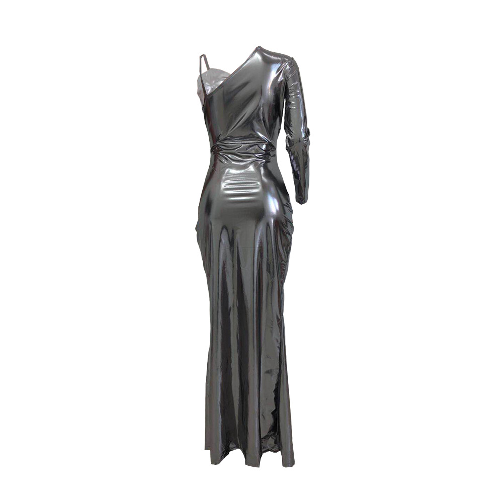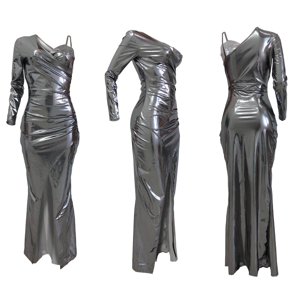 Metallic Silver/Gold Ruched Faux Leather One Sleeve Irregular High Slit Formal Maxi Dress