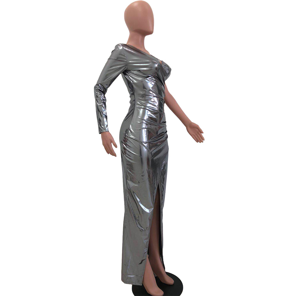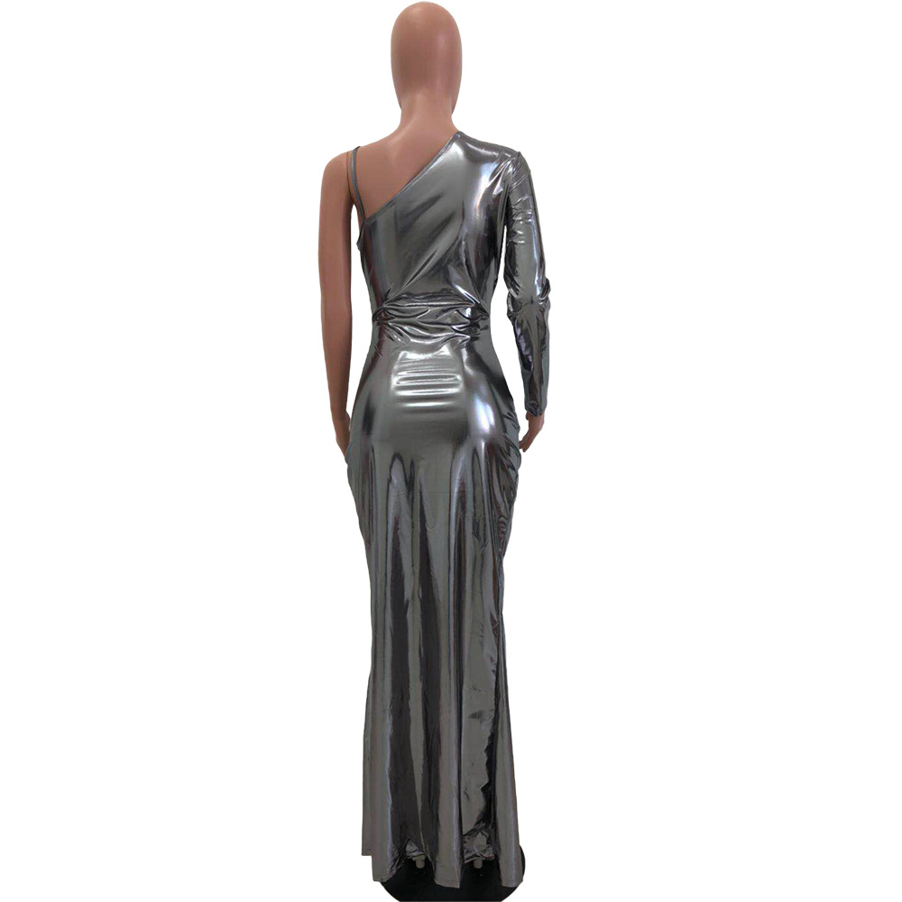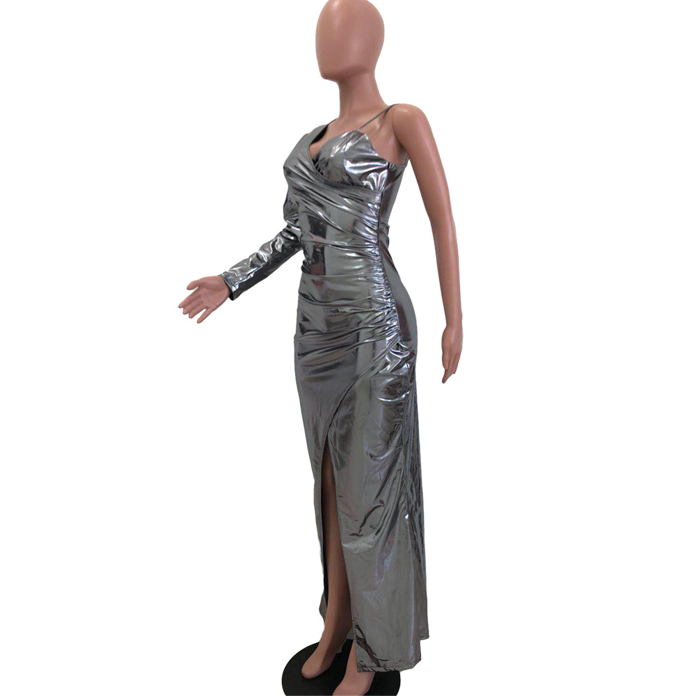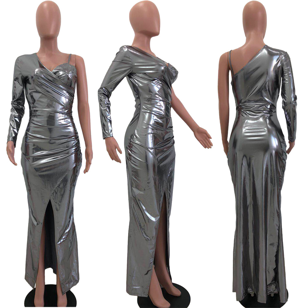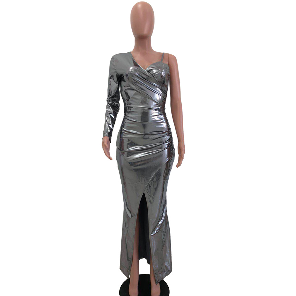 Metallic Silver/Gold Ruched Faux Leather One Sleeve Irregular High Slit Formal Maxi Dress