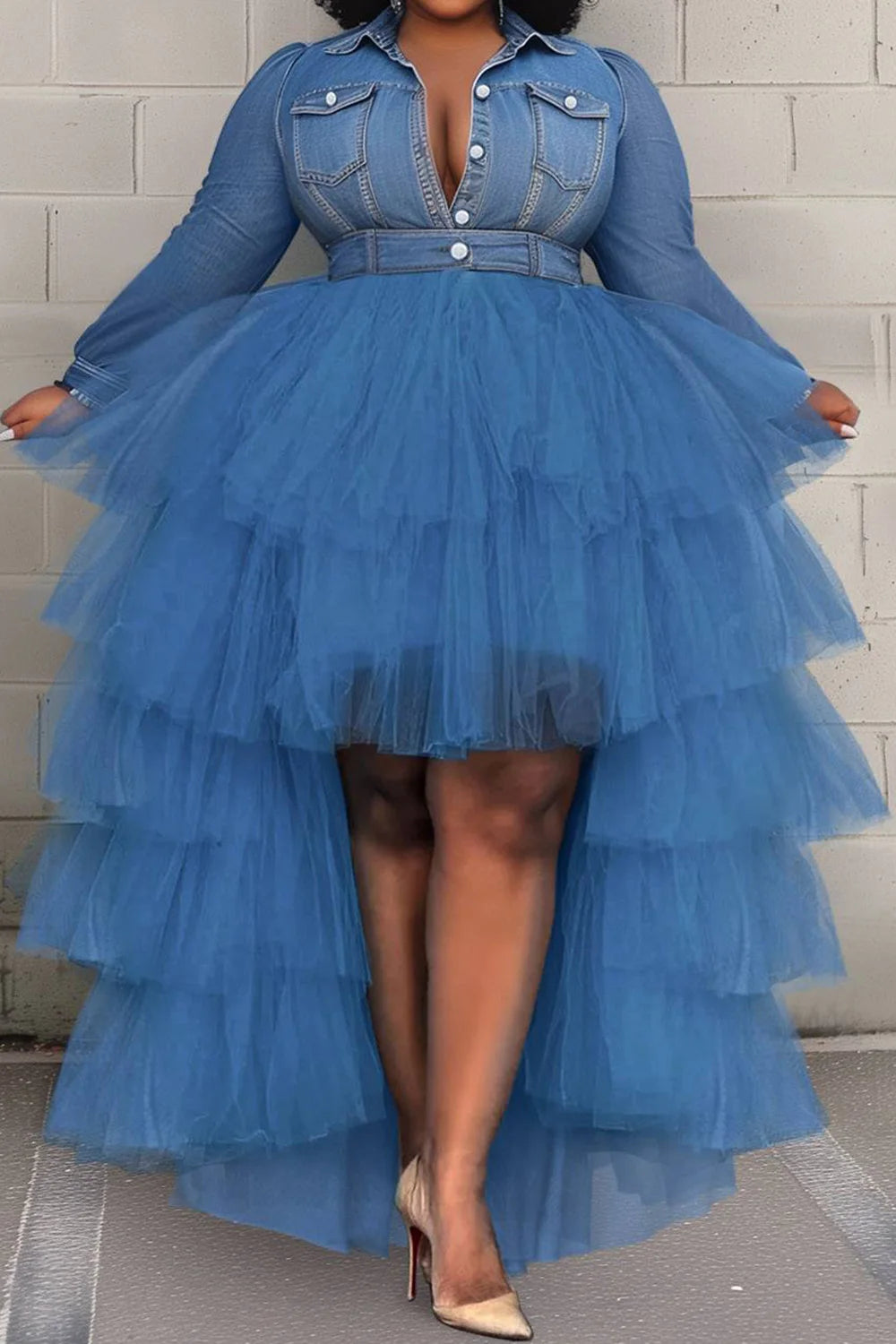 Denim Blue Button-Up Turn-Down Collar Tiered Patchwork Long Sleeve Tulle Tutu Skirt Dress to 5X Plus Size
