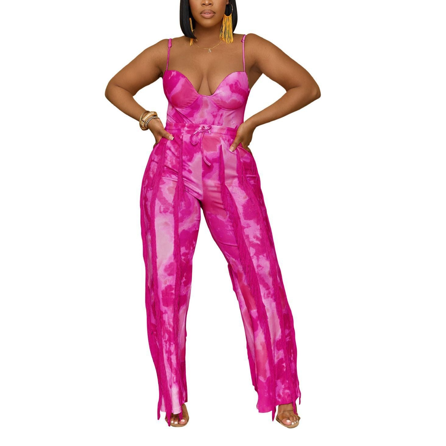 Lace Tassel Fringe Detail Sleeveless Women's Spaghetti Strap Cami Top + Leggings 2-Piece Set