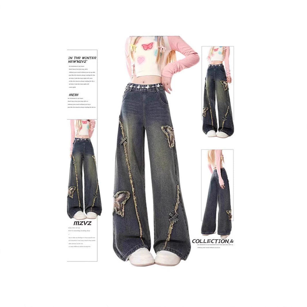 Vintage Faded Denim Butterfly Patch Design Raw Edge Women's Wide Leg Jeans