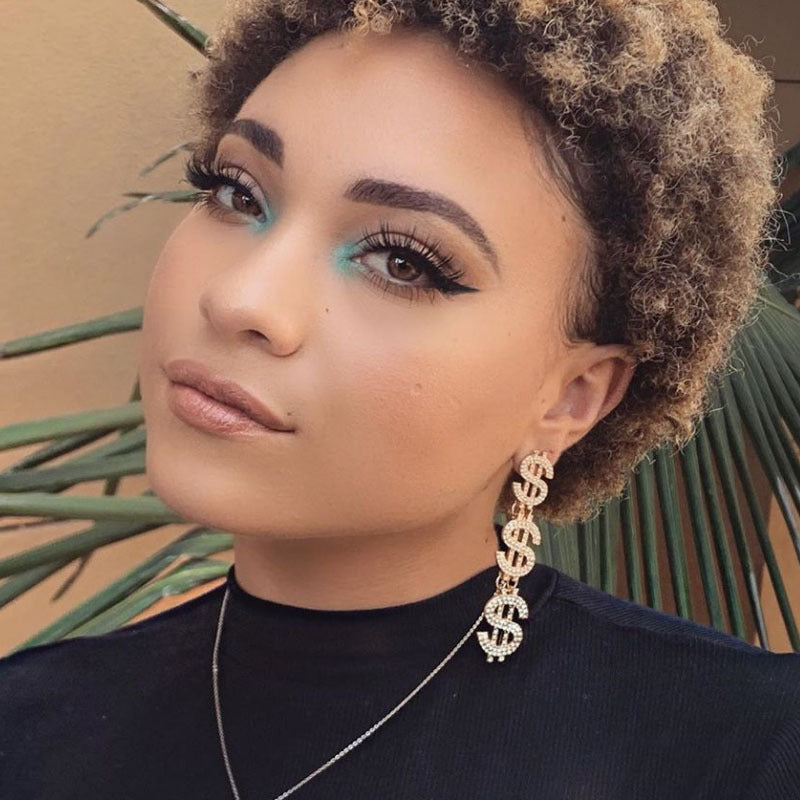 Rhinestone Sparkling Triple Money Sign Symbol Hanging Drop Earrings