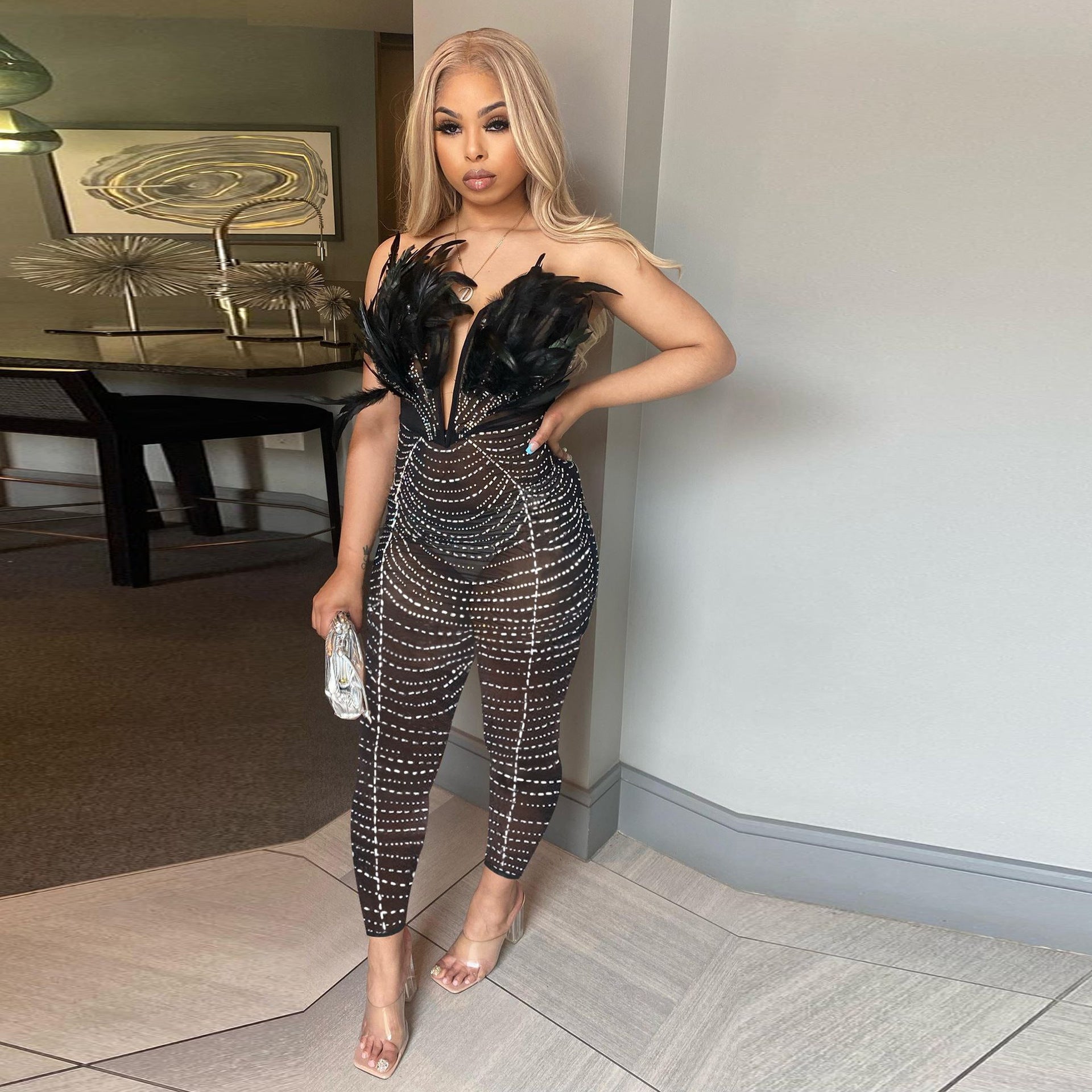 Black Feather Rhinestone Fringe Embellished Deep V-Neck Sleeveless Women's Formal Tube Top Jumpsuit to 3X Plus Size