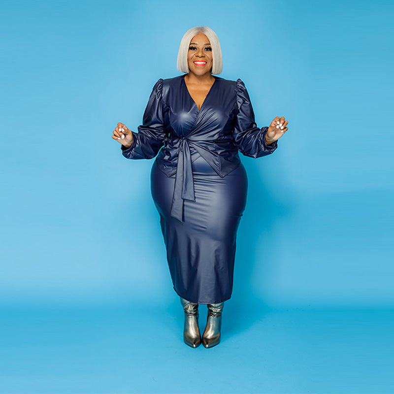 PU Leather Ruched Long Balloon Sleeve Sleeve Solid Color Women's Maxi Dress w/ Sash Belt to 5X Plus Size