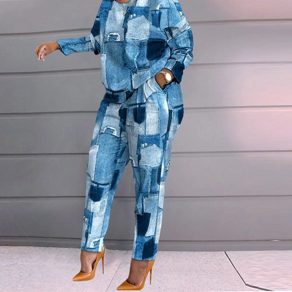 Geometric Colorblock Plus Ladies Faux Denim Printed 2-Piece Sets To 3X Plus Size