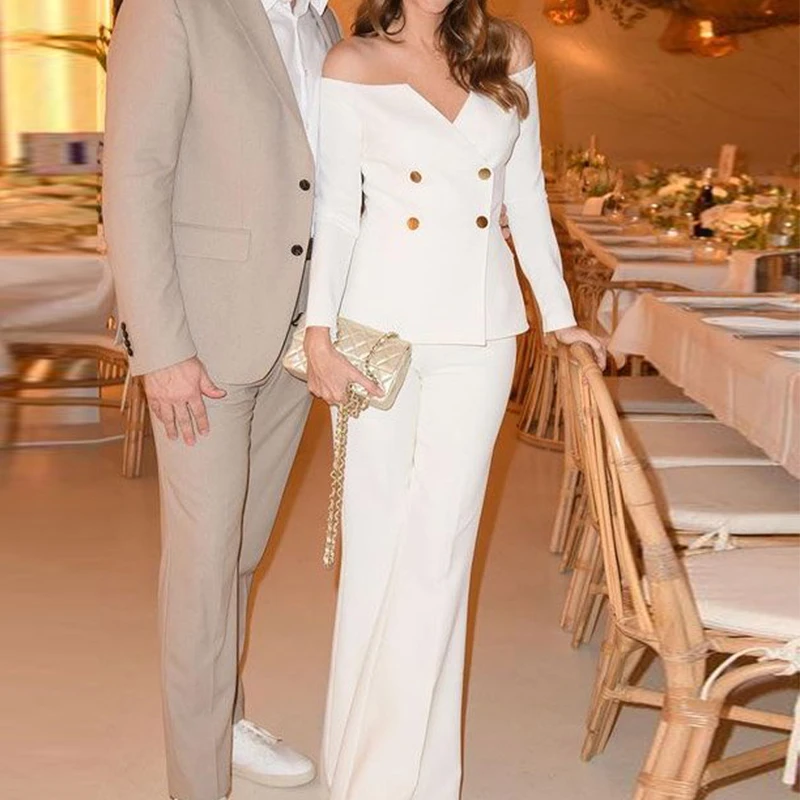 White One Shoulder V-Neck Solid Double Button Row Blazer + Loose Flare Pants Ladies Suit