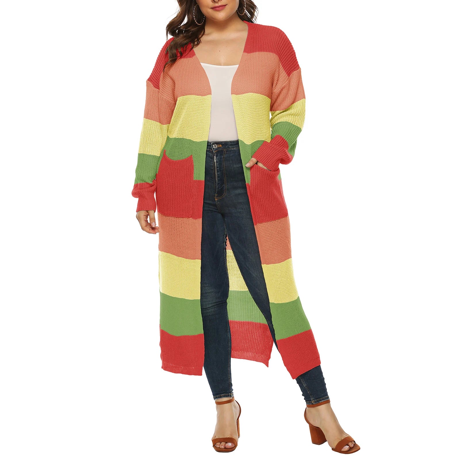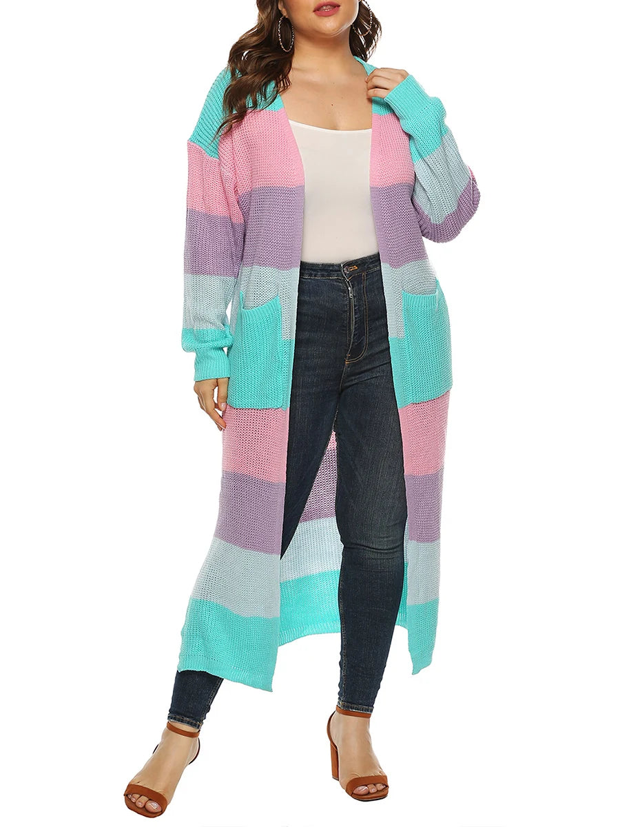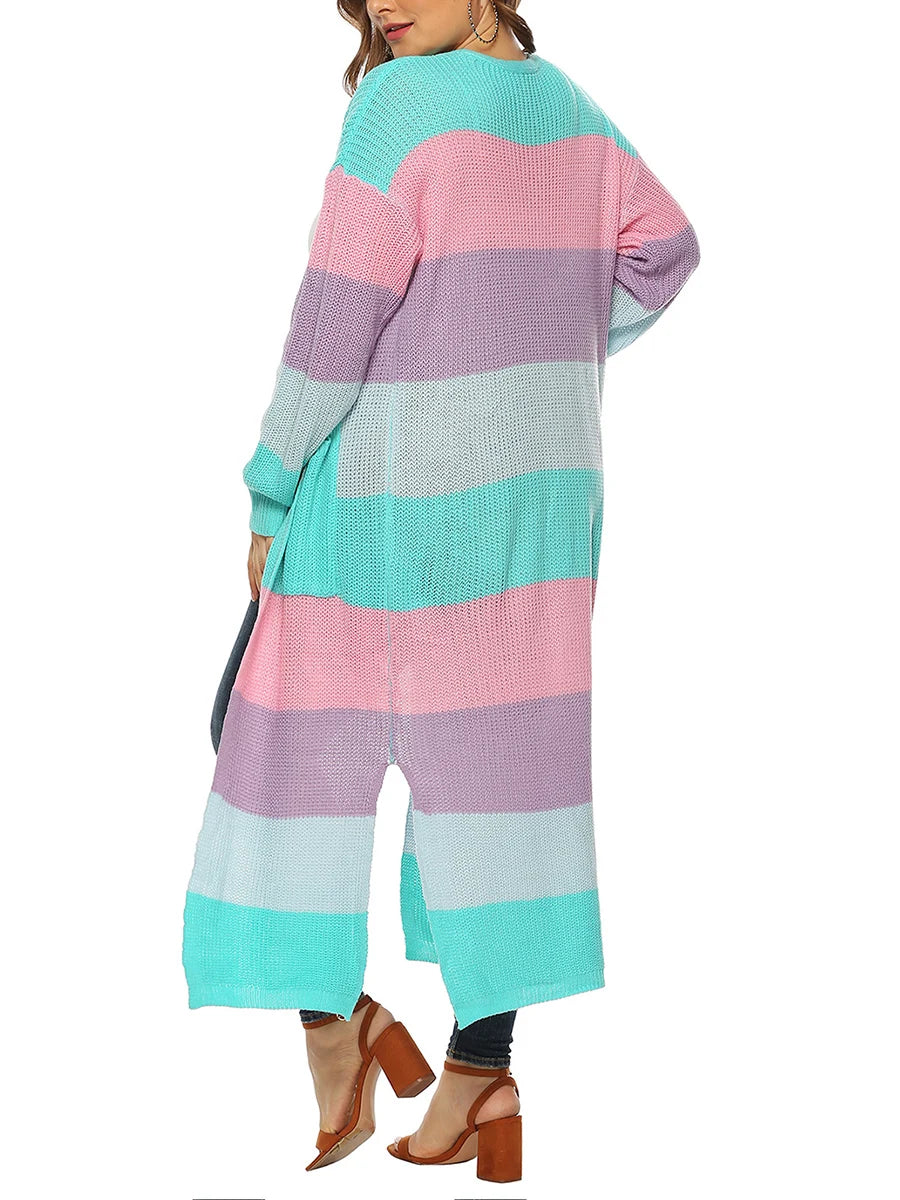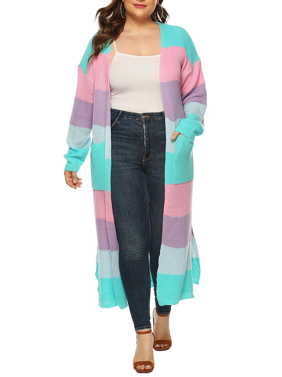 Striped Colorblock Women's Open FrontLong Sleeve Contrast Color Maxi Cardigan Sweater to 3X Plus Size