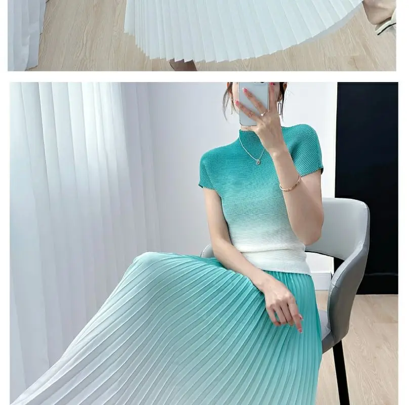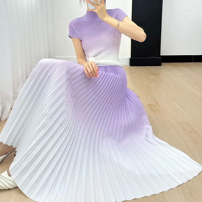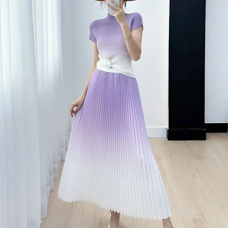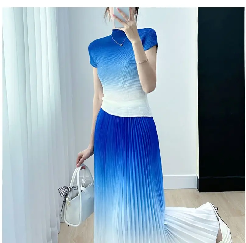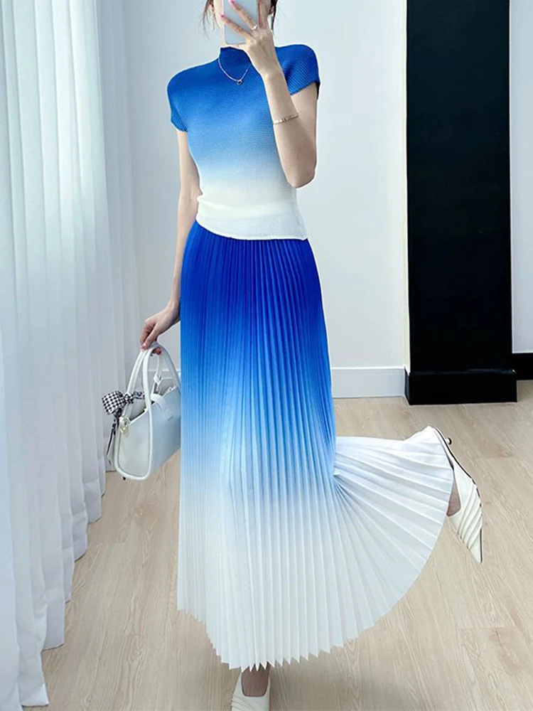Gradient Colorblock Short Sleeve Women's Top + Pleated Maxi Skirt 2-Piece Set