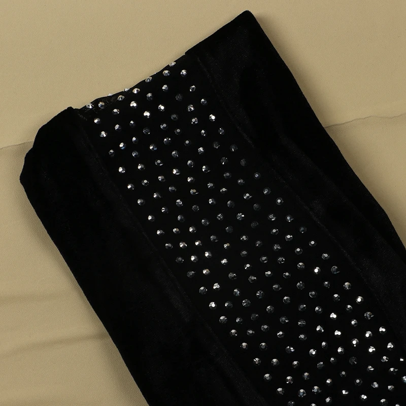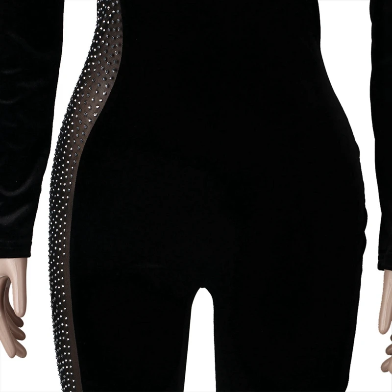 Velvet Rhinestone Patchwork Mesh Bodycon Jumpsuit