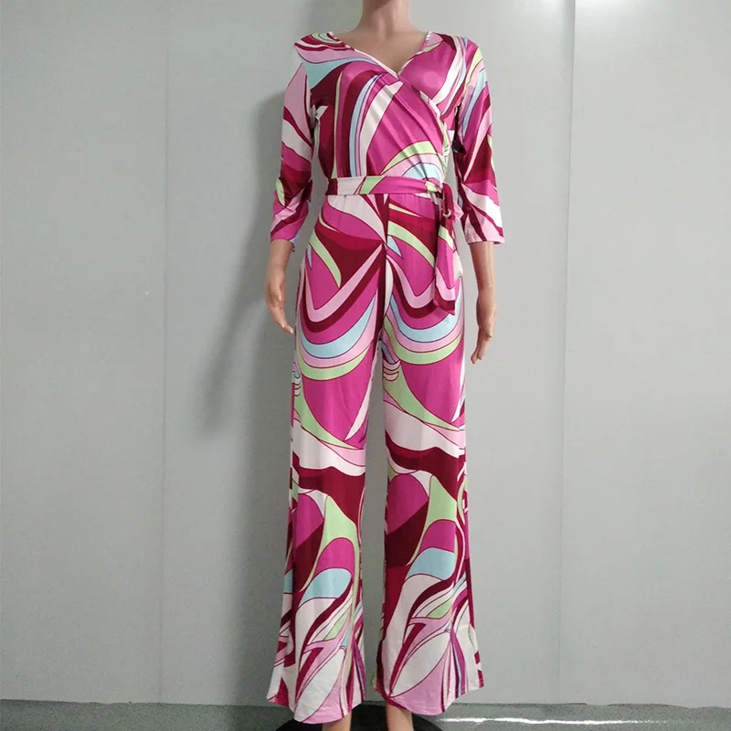 Swirl Design V-Neck Belted Wide Leg Long Sleeve Jumpsuit