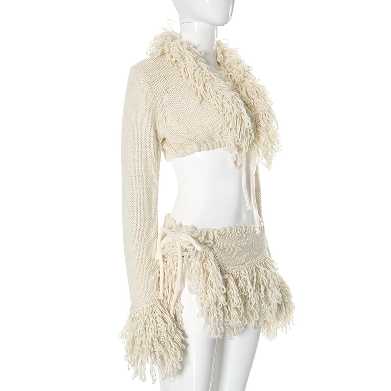 French Knitted Tassel Fringe Trim Long Sleeve Cropped Cardigan + Mini Skirt 2-Piece Set