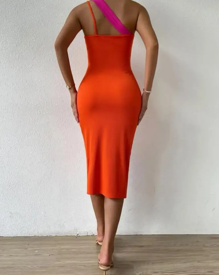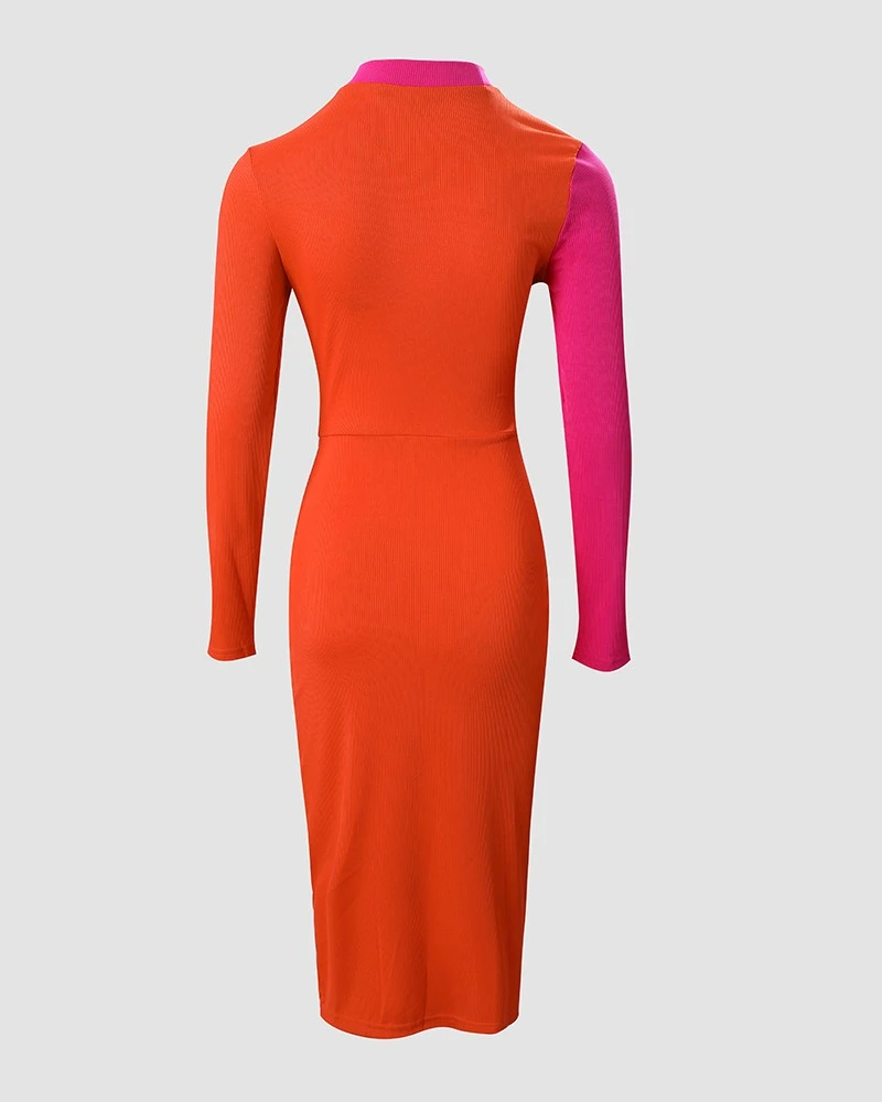 Colorblock Zipper Detail Long Sleeve Mock Neck Bodycon Midi Dress