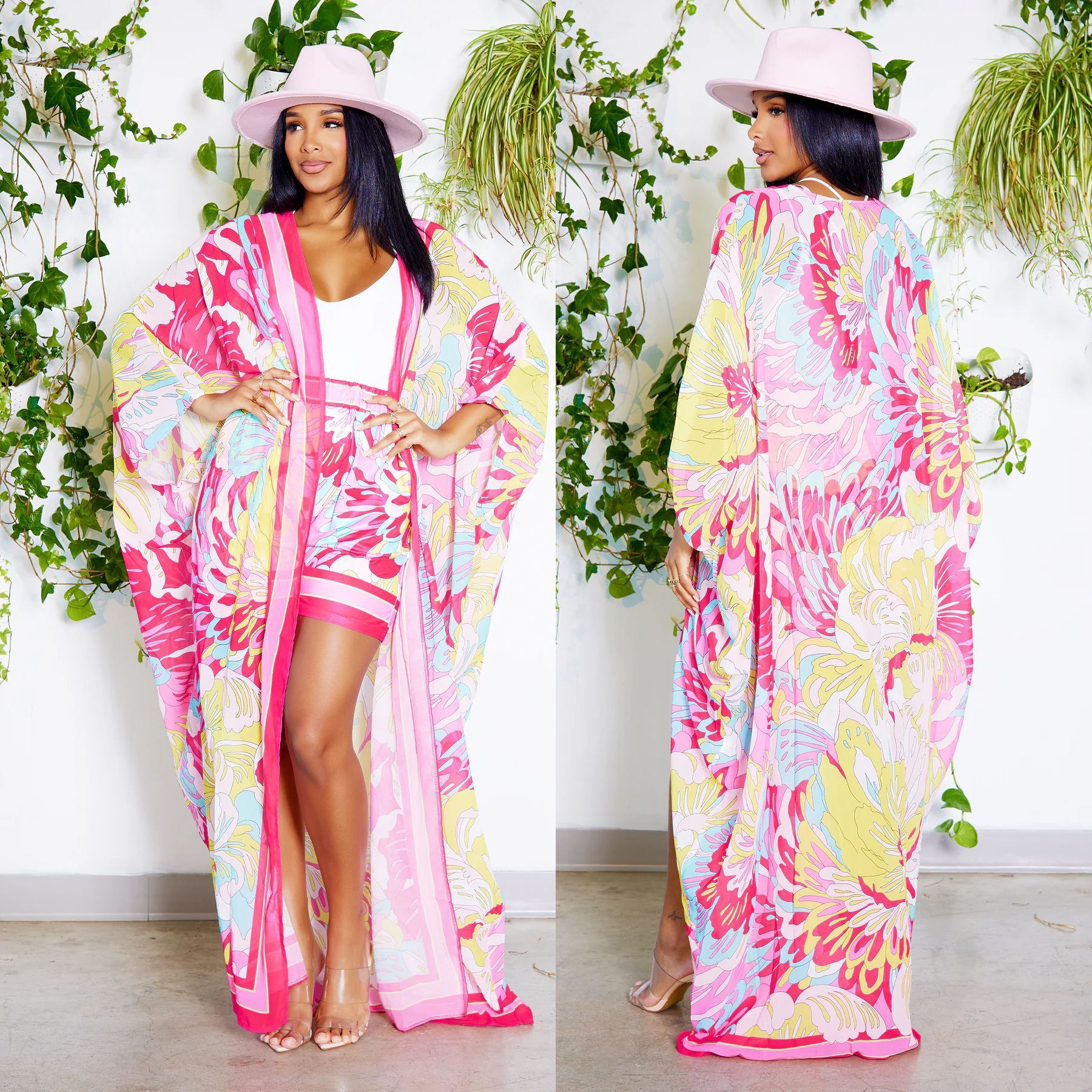 Chiffon Tropical Floral Print Maxi Cardigan Blouse w/ Matching Shorts 2-Piece Set