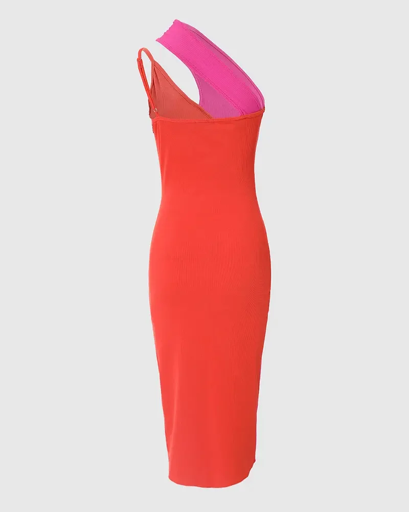 Colorblock Patchwork Cutout One Shoulder Sleeveless Midi Bodycon Slit Dress