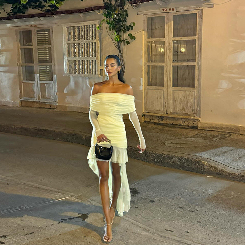 Black/White Ruffled Long Sleeve High-Low Flowing Train Pleated Ruched Off-the-Shoulder Formal Dress