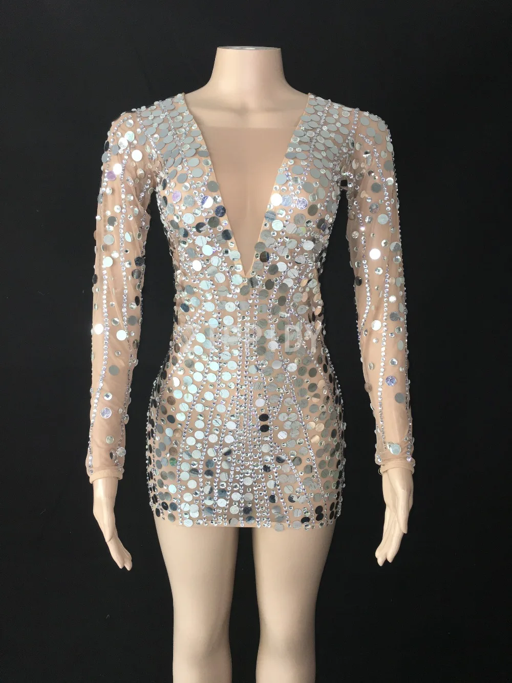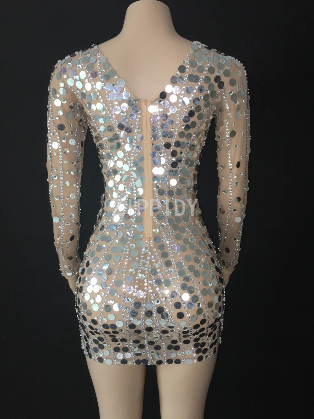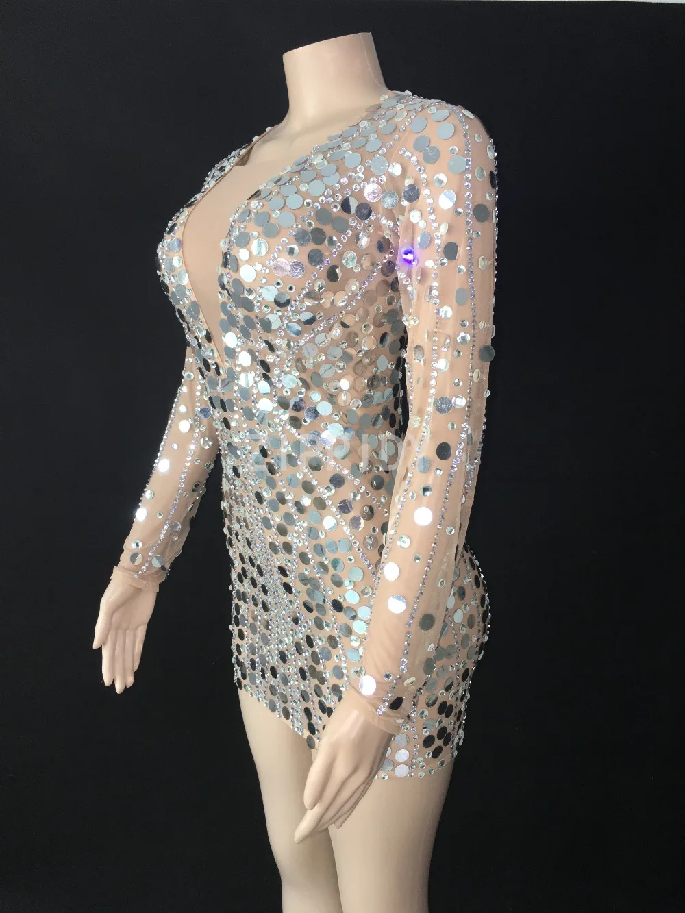 Silver Metallic Sparkling Sequin Feather Detail Mini Formal Salsa/Party Dress