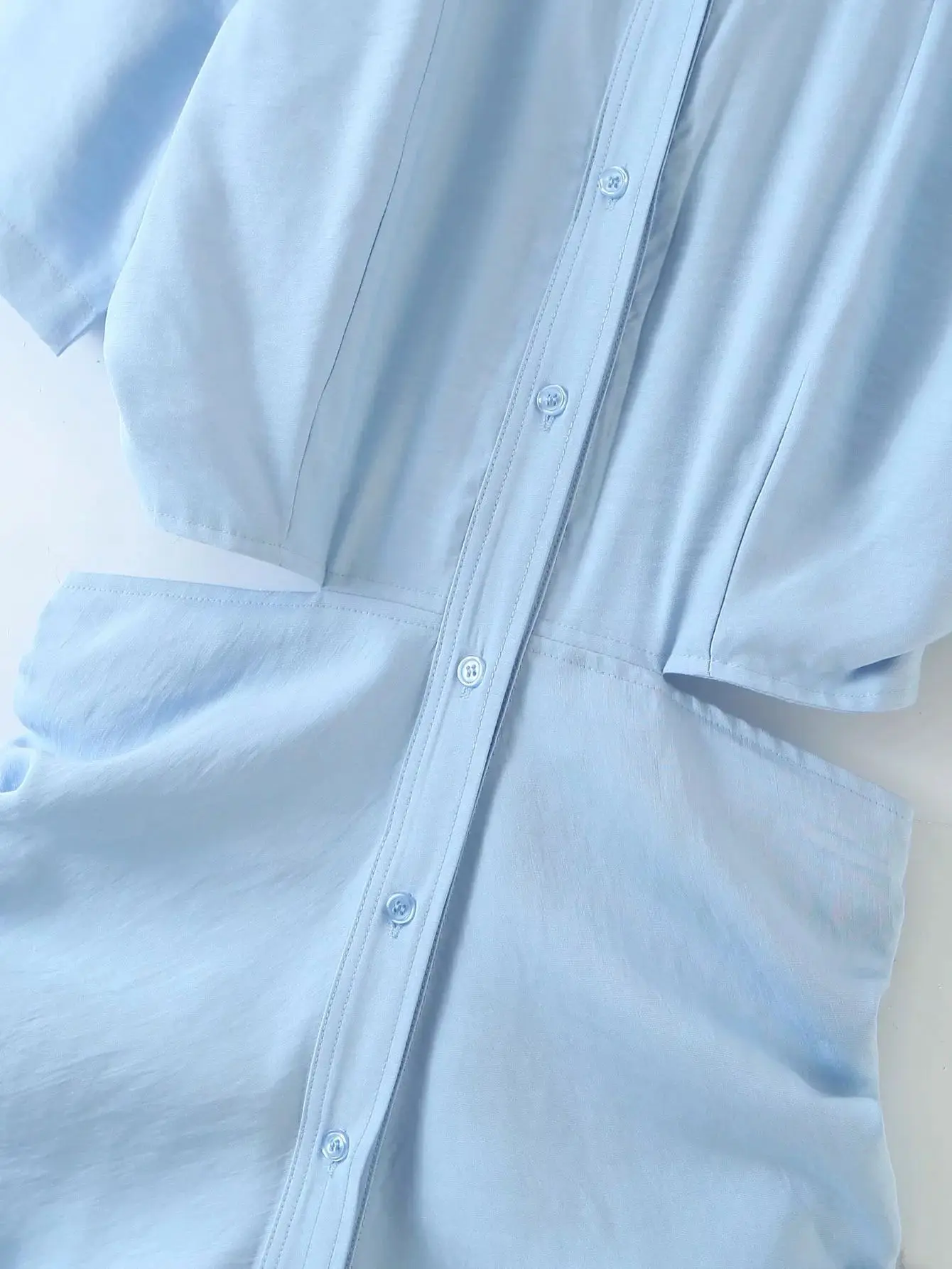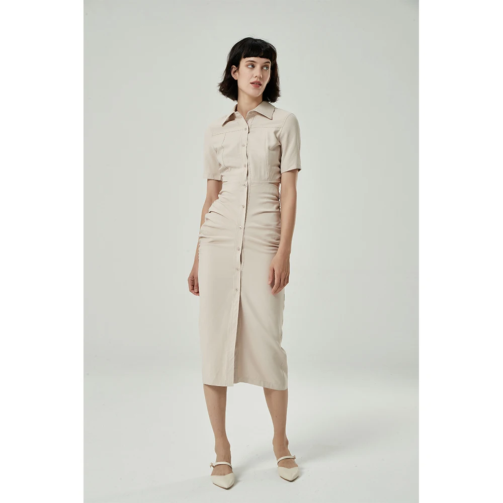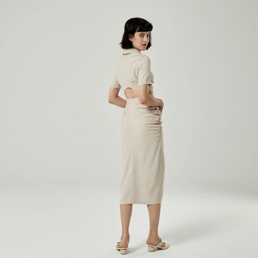 Ruched Solid Turn-Down Collar Cut-Out Waist Short Sleeved Bodycon Midi Dress