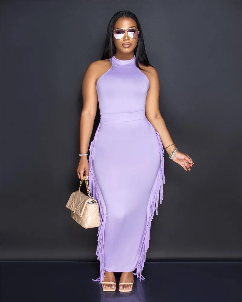 Tassel Design Sleeveless Top + Bodycon Maxi Skirt Matching Set