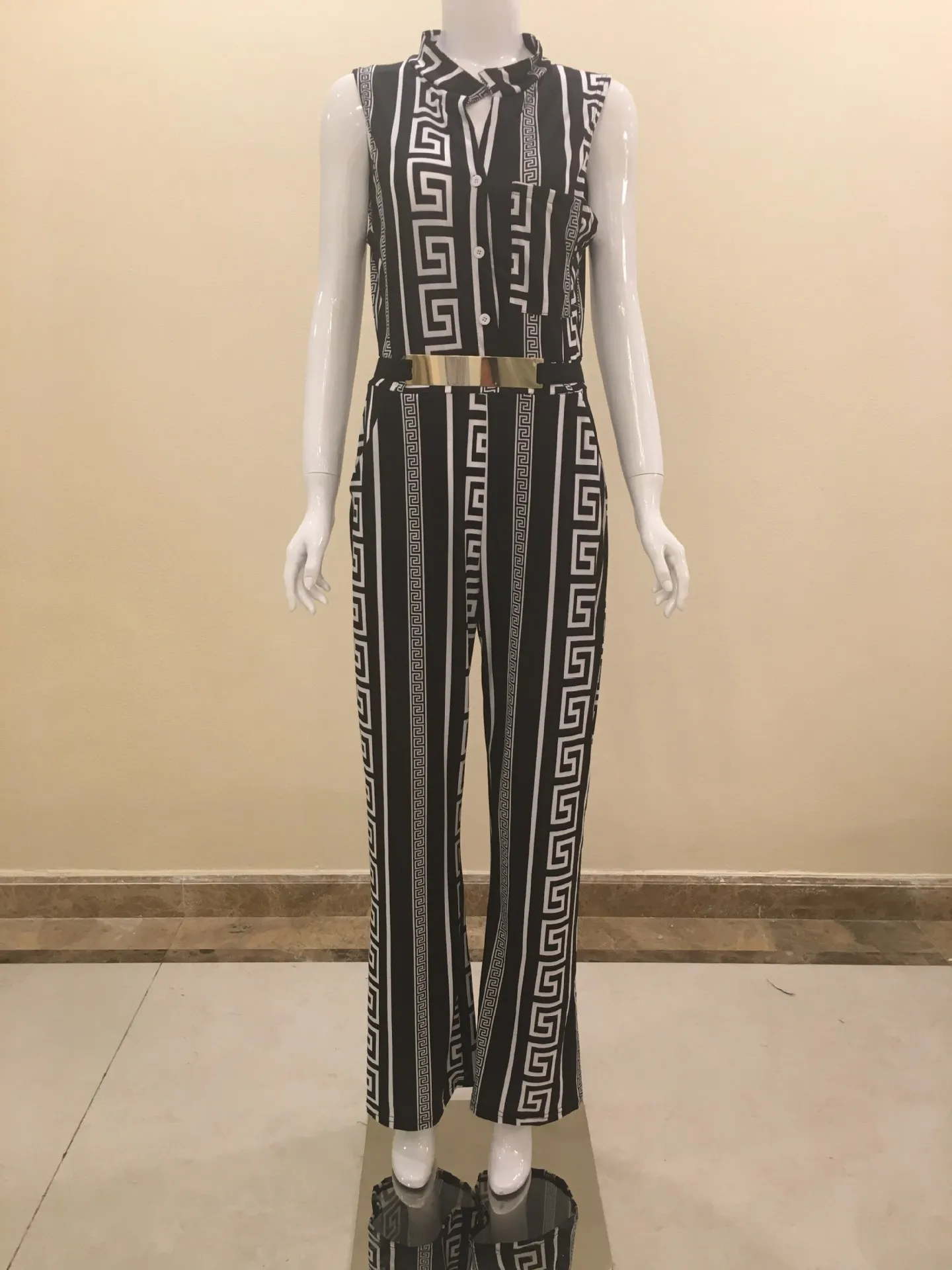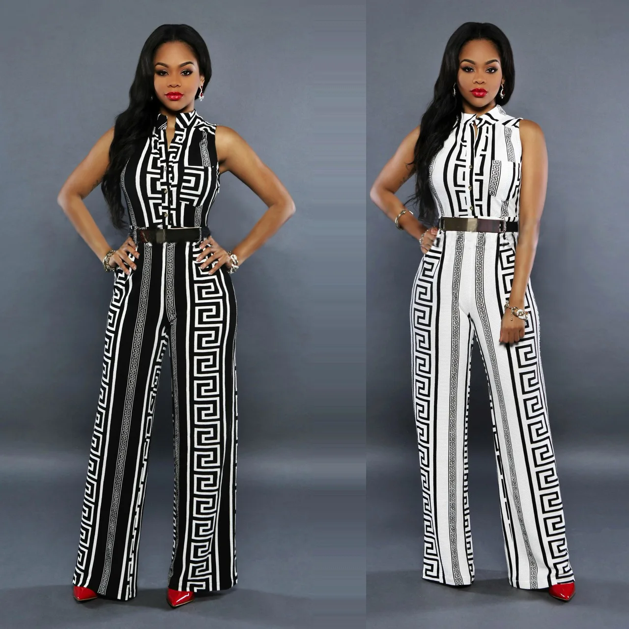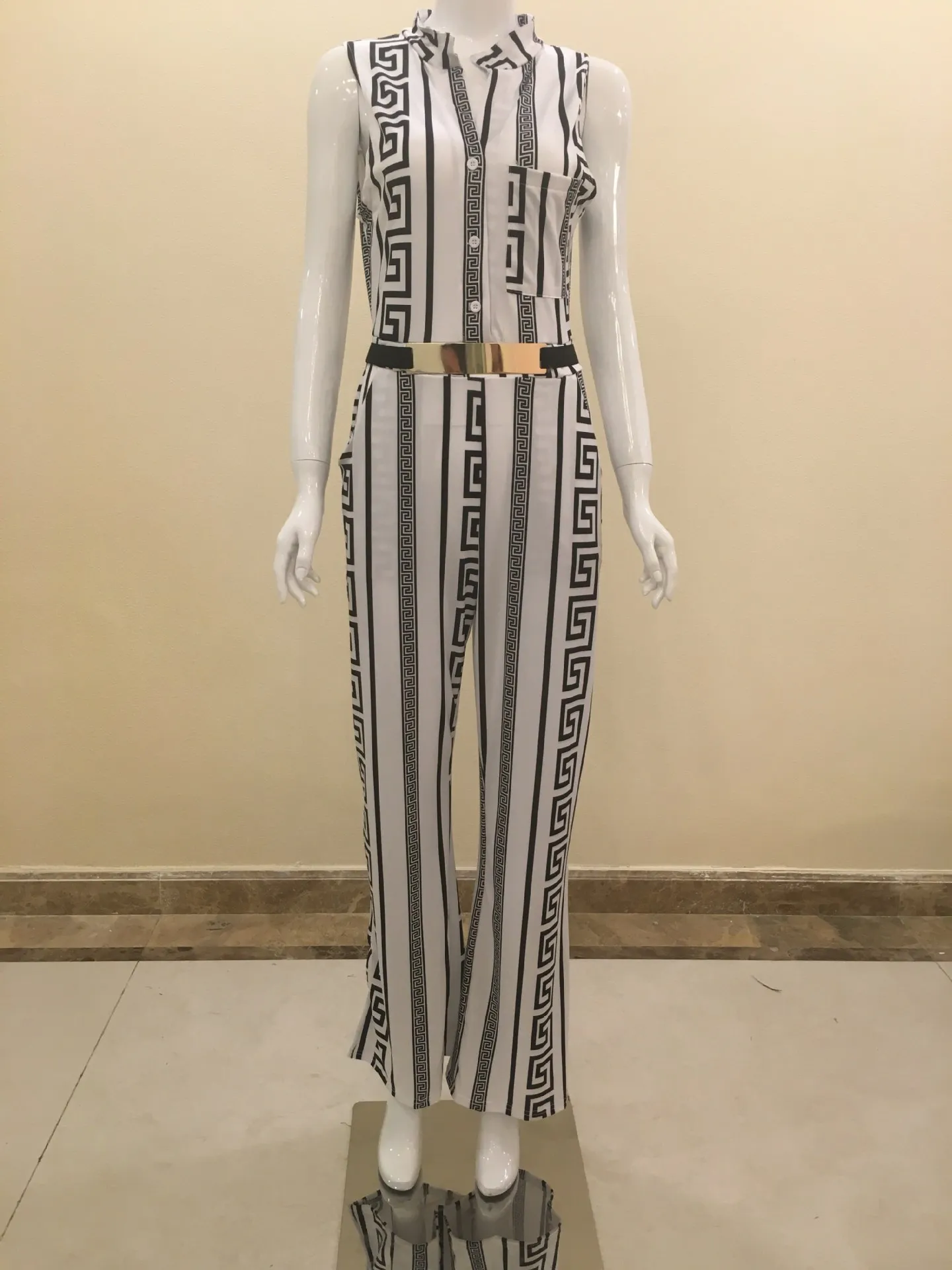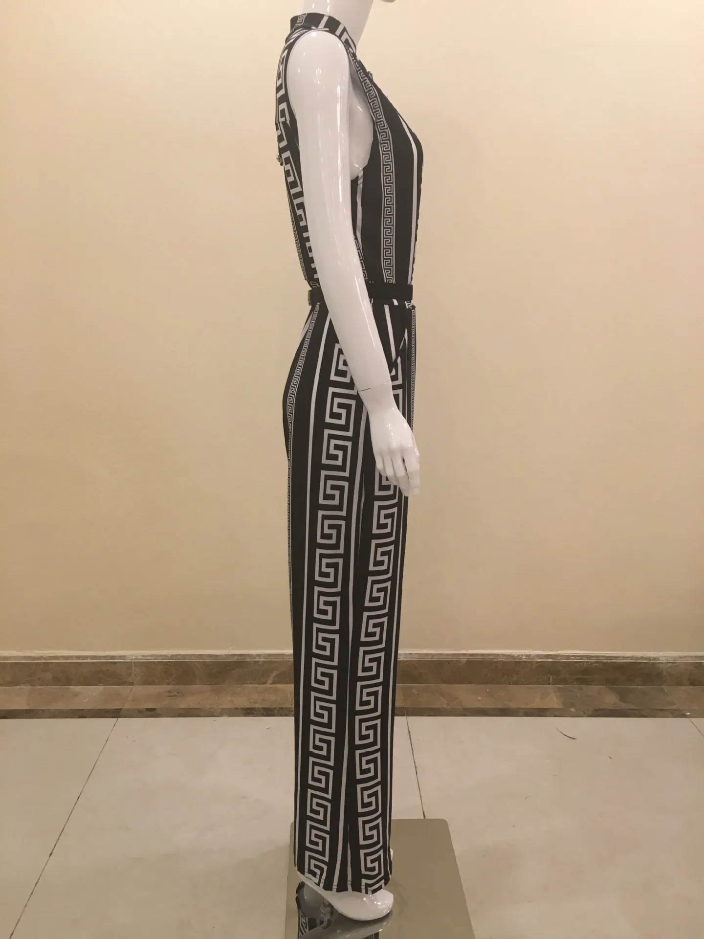 Geometric Black/White V-Neck Sleeveless Belted Jumpsuit