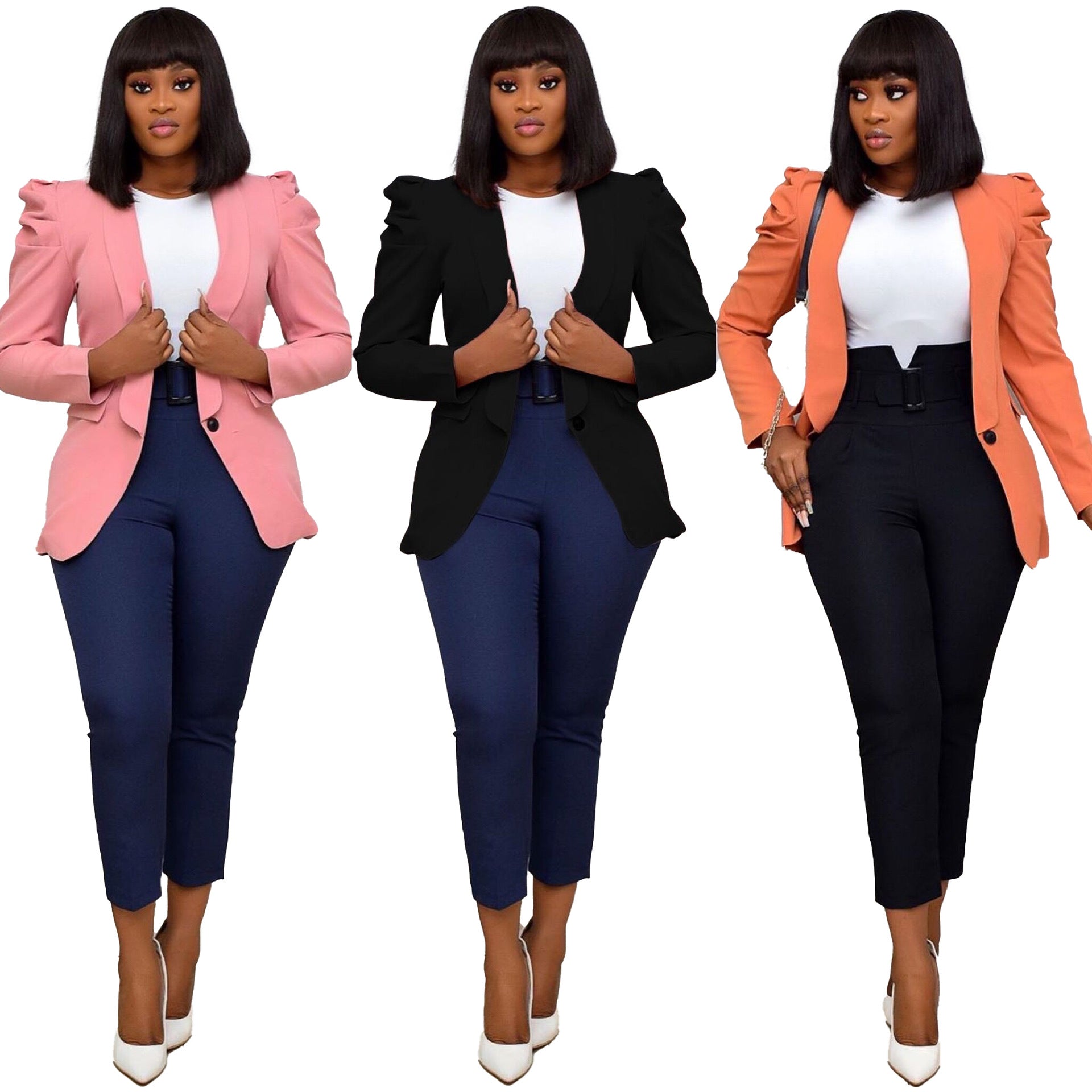 Balloon Sleeve Pleated Solid Color Women's Button Blazer Jacket