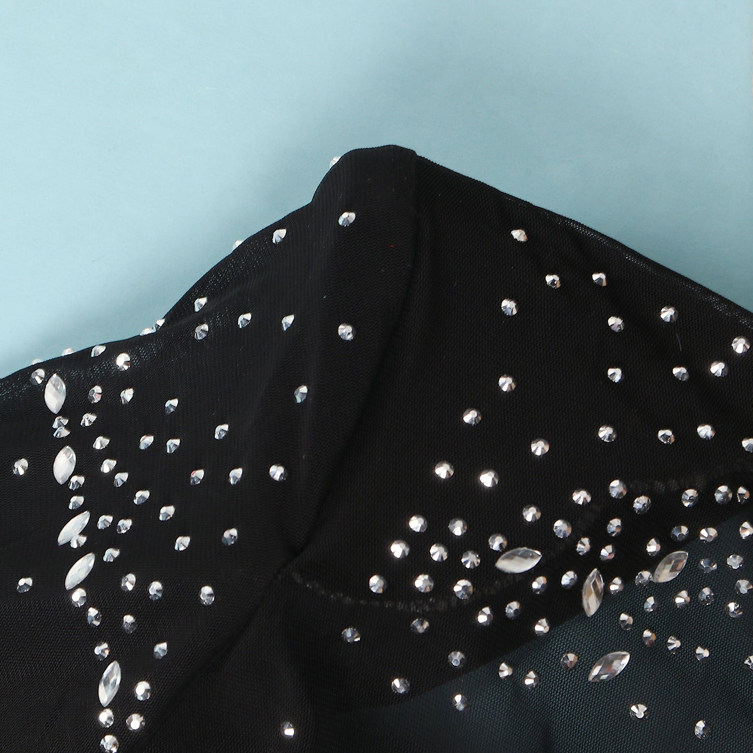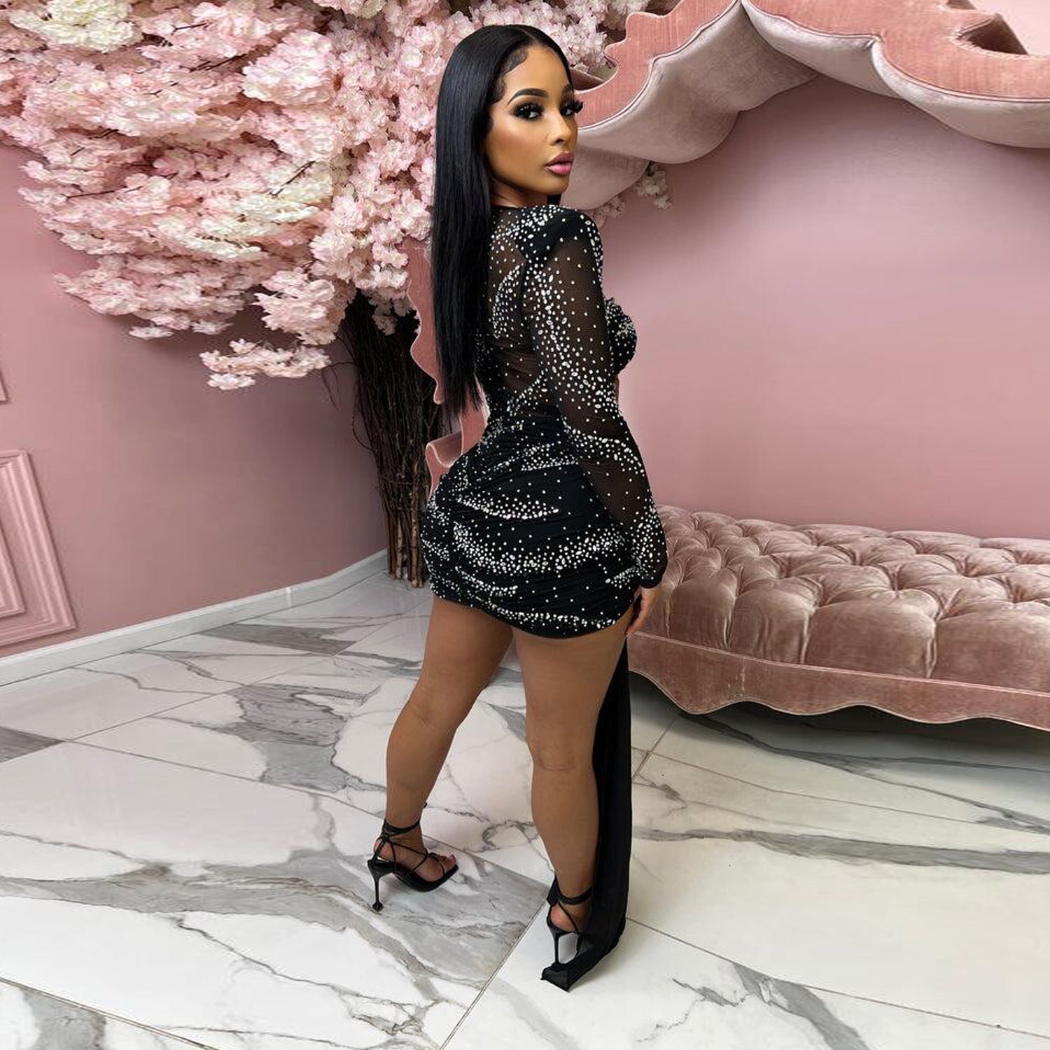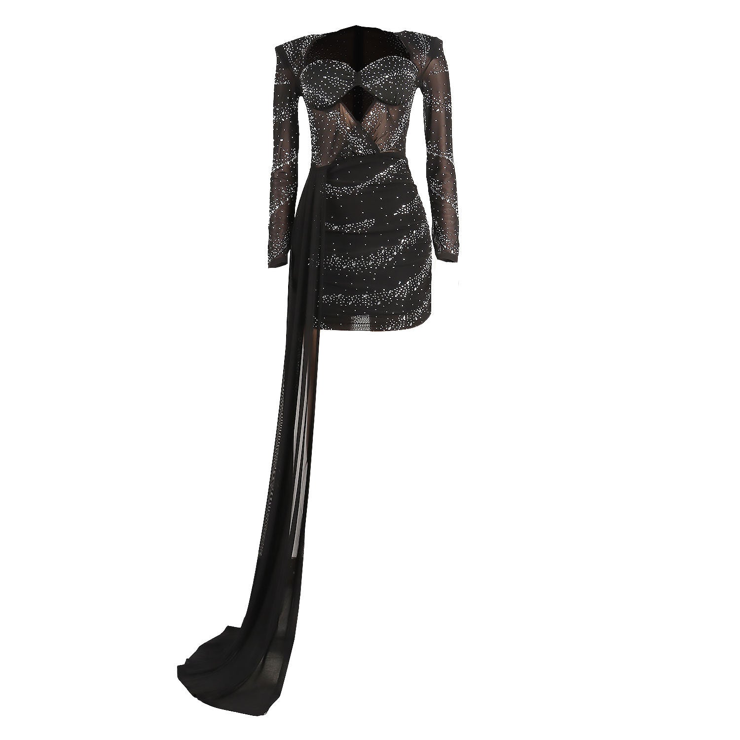 Rhinestone Hot Drill Padded Shoulder Hollow-Out Skinny Mini Formal Dress w/ Sweep Train