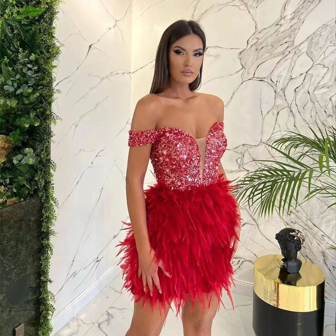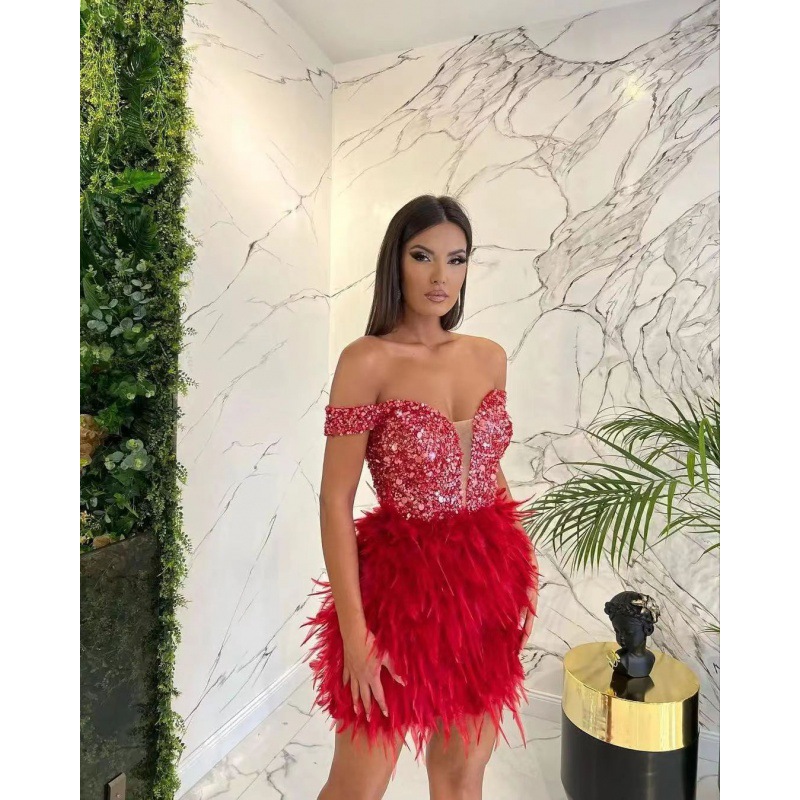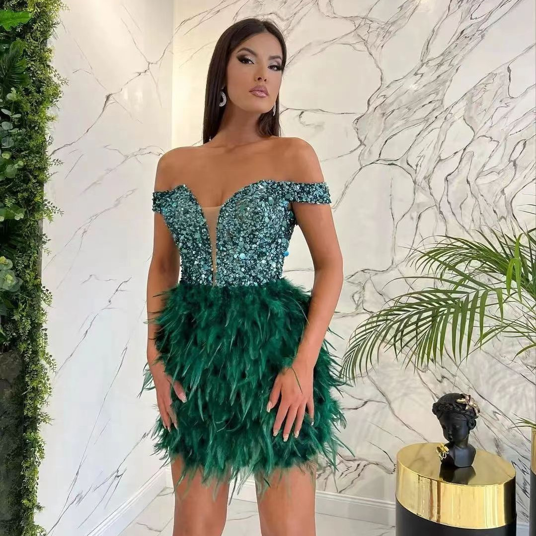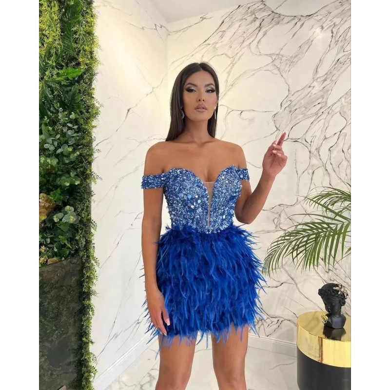 Sequined Feather Design V-Neck Off-the-Shoulder Formal Party Dress