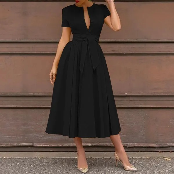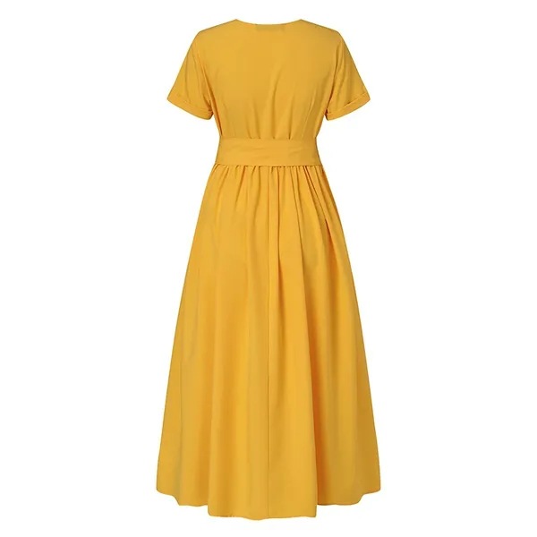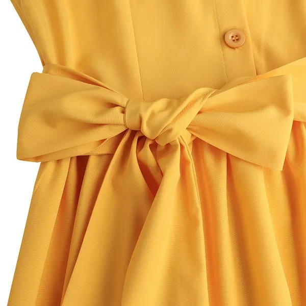 Button Front O-Neck Short Sleeve Flared Shirt Dress w/ Sash Belt