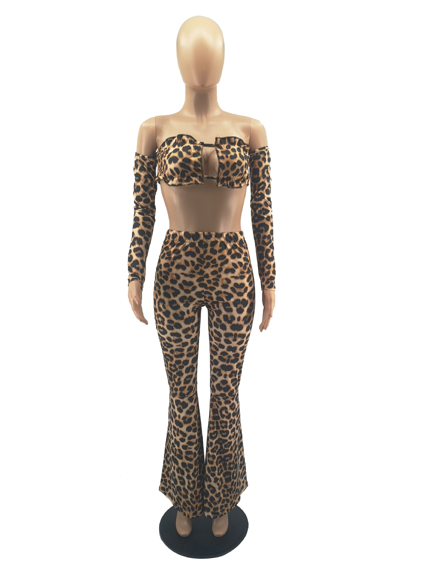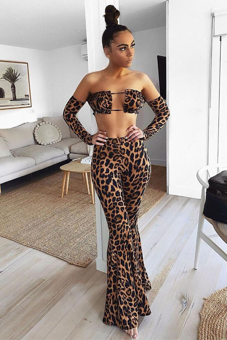 Leopard Print Sleeveless Hollow-Out Long Sleeve Crop Top + Wide Flared Leg Leggings Women's 2-Piece Set