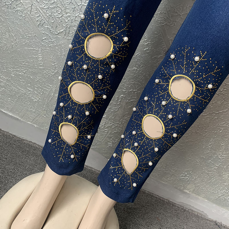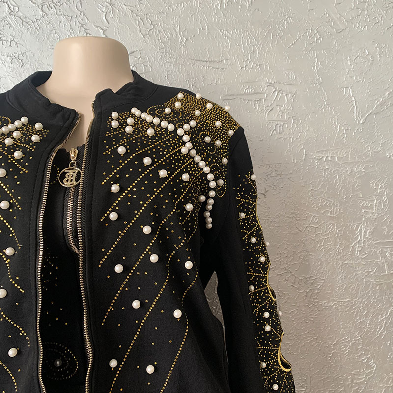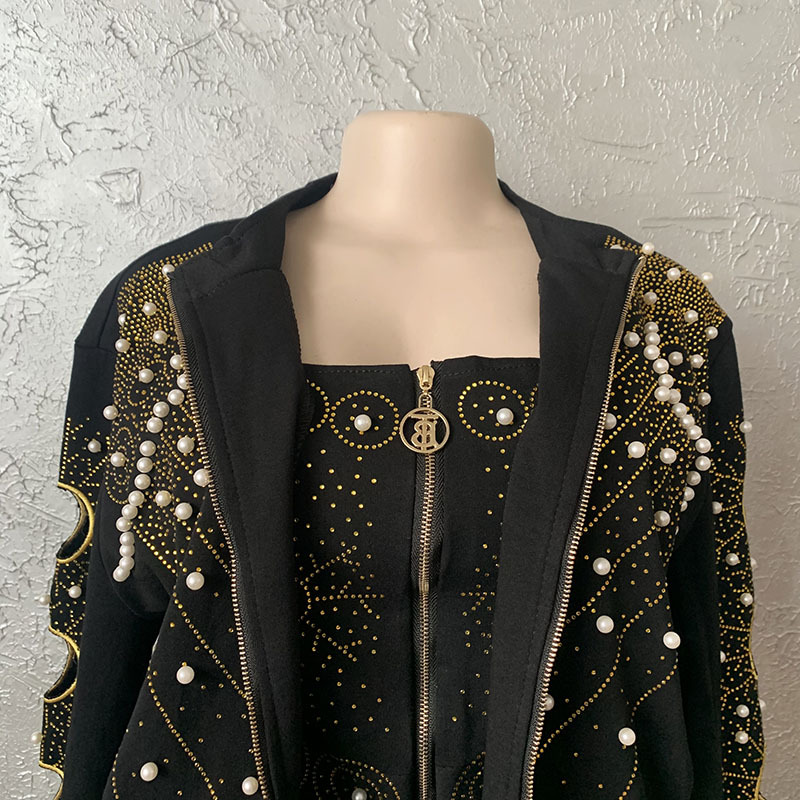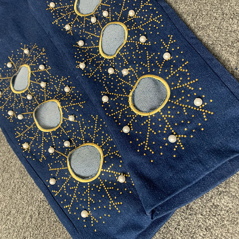 Denim Hot Rhinestone Beaded Embroidered Long Sleeve Jacket + Tube Top + Trouser Jeans Women's 3-Piece Set