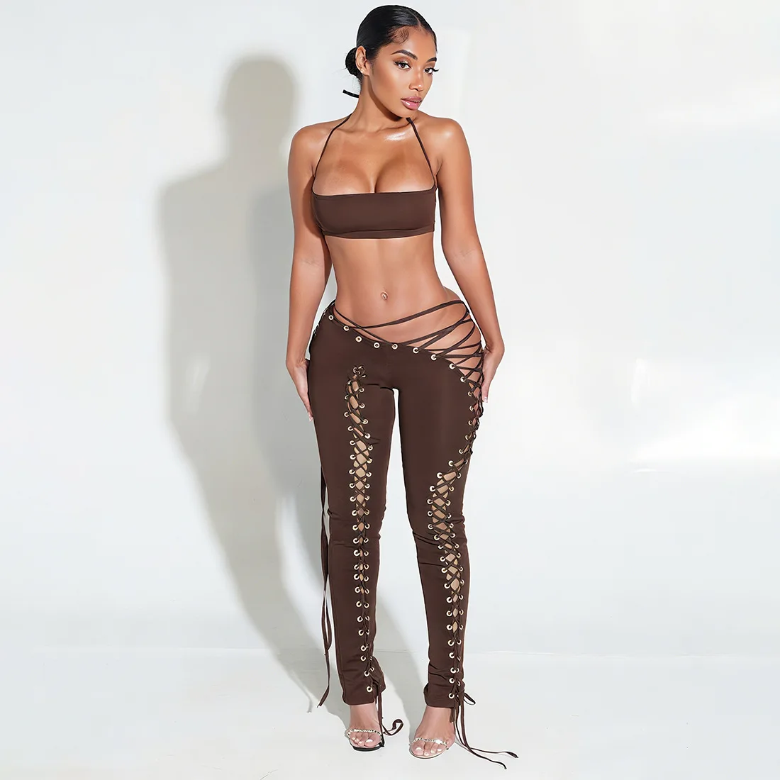 Sexy Women's Sleeveless Crop Tank Top + Criss-Cross Lace-Up Hollow-Out Bandage Leggings 2-Piece Set