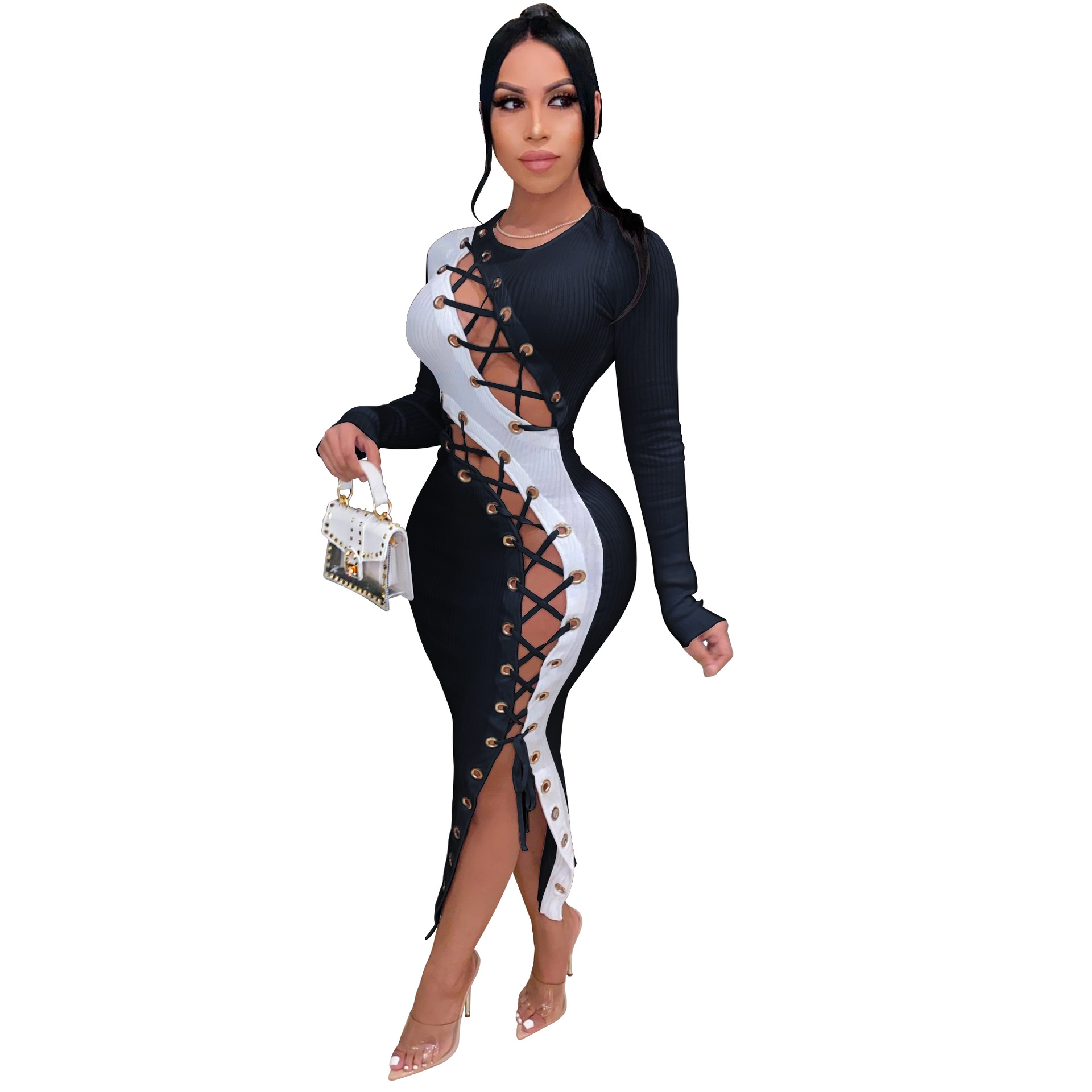 Colorblock/Solid Color Lace-Up Pattern Long Sleeve Skin Tight Hollow-Out Bodycon Dress
