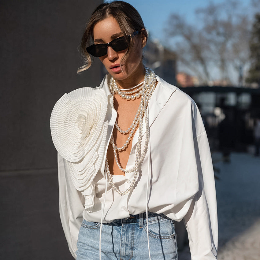 Big Flower Lapel Design Mosiac Women's Long Sleeve Dress Shirt