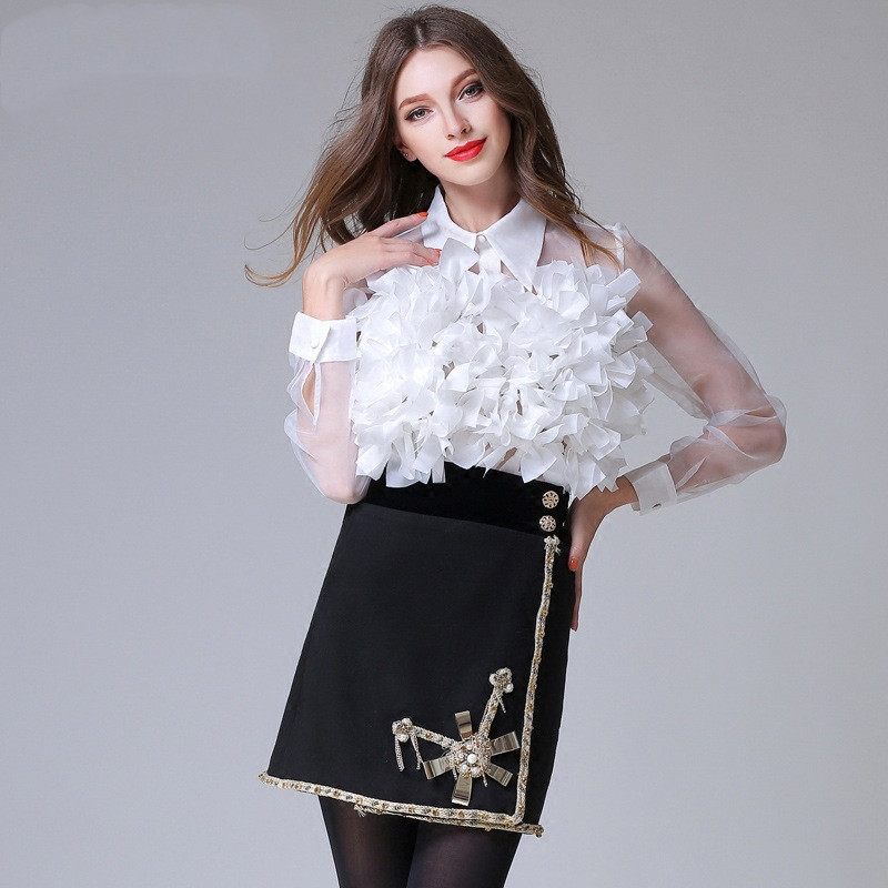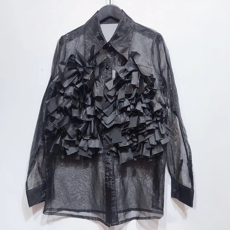 Big Flower Design Transparent Organza Women's Long Sleeve Dress Shirt