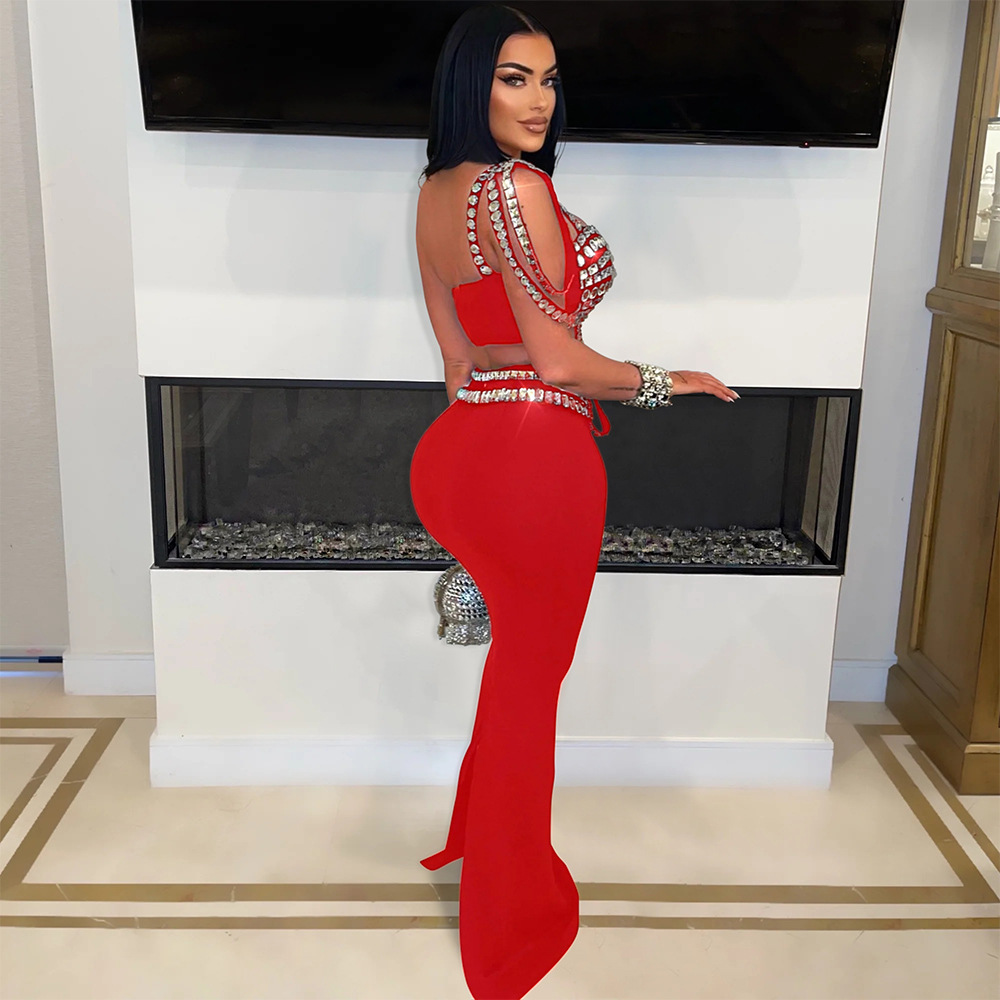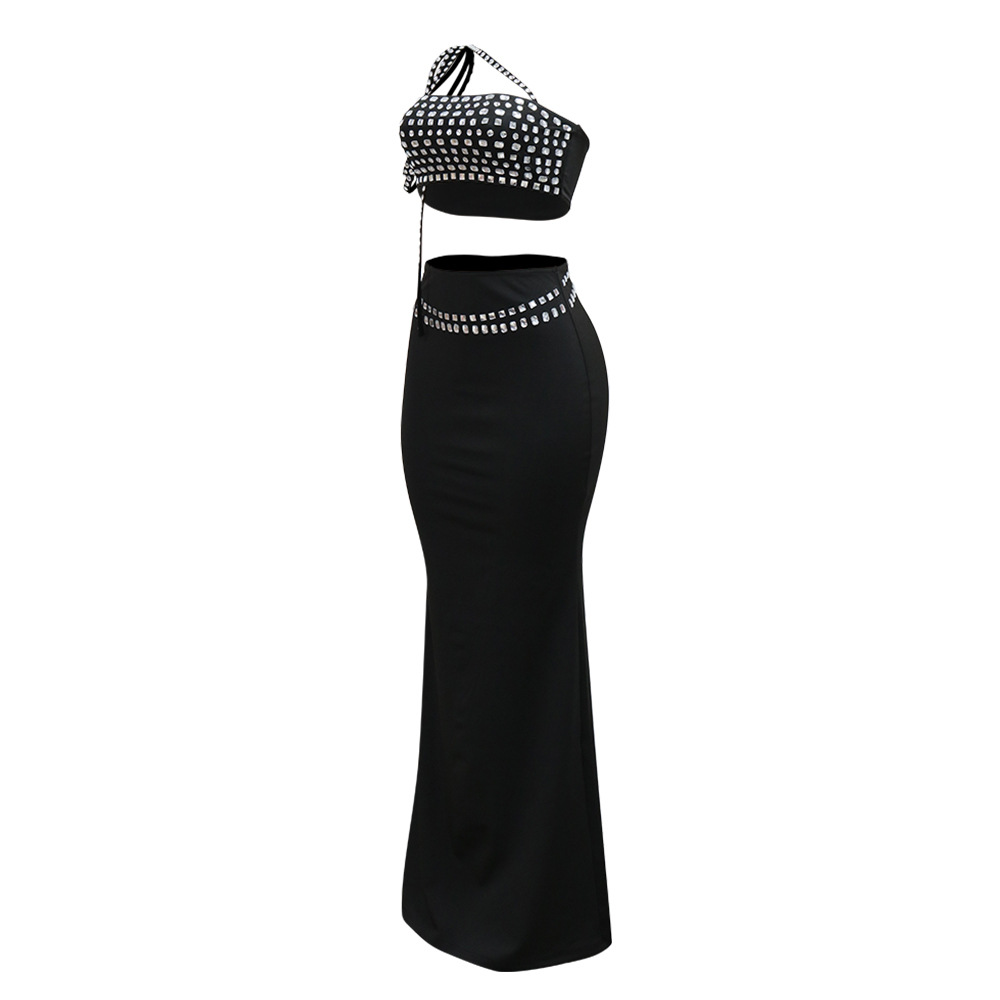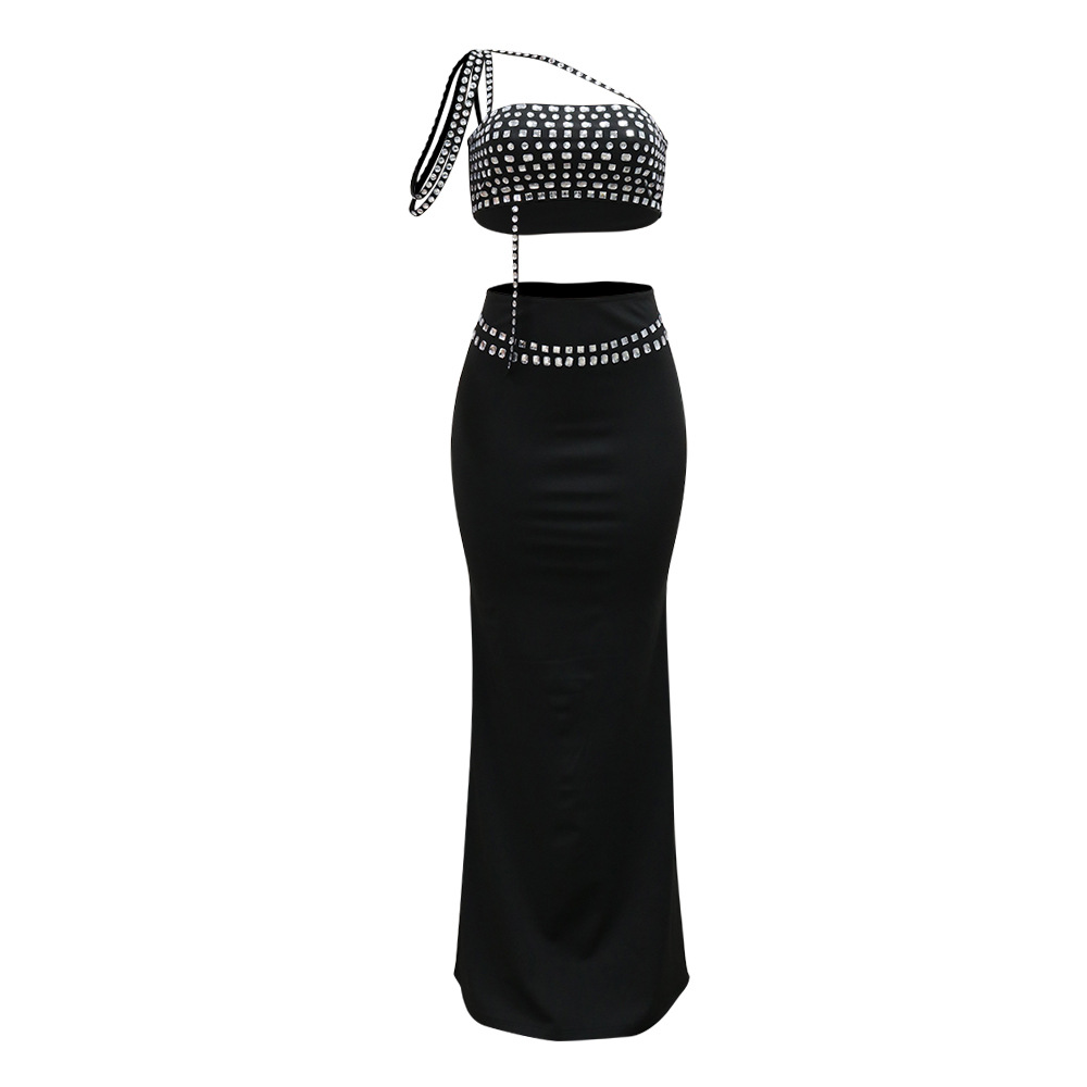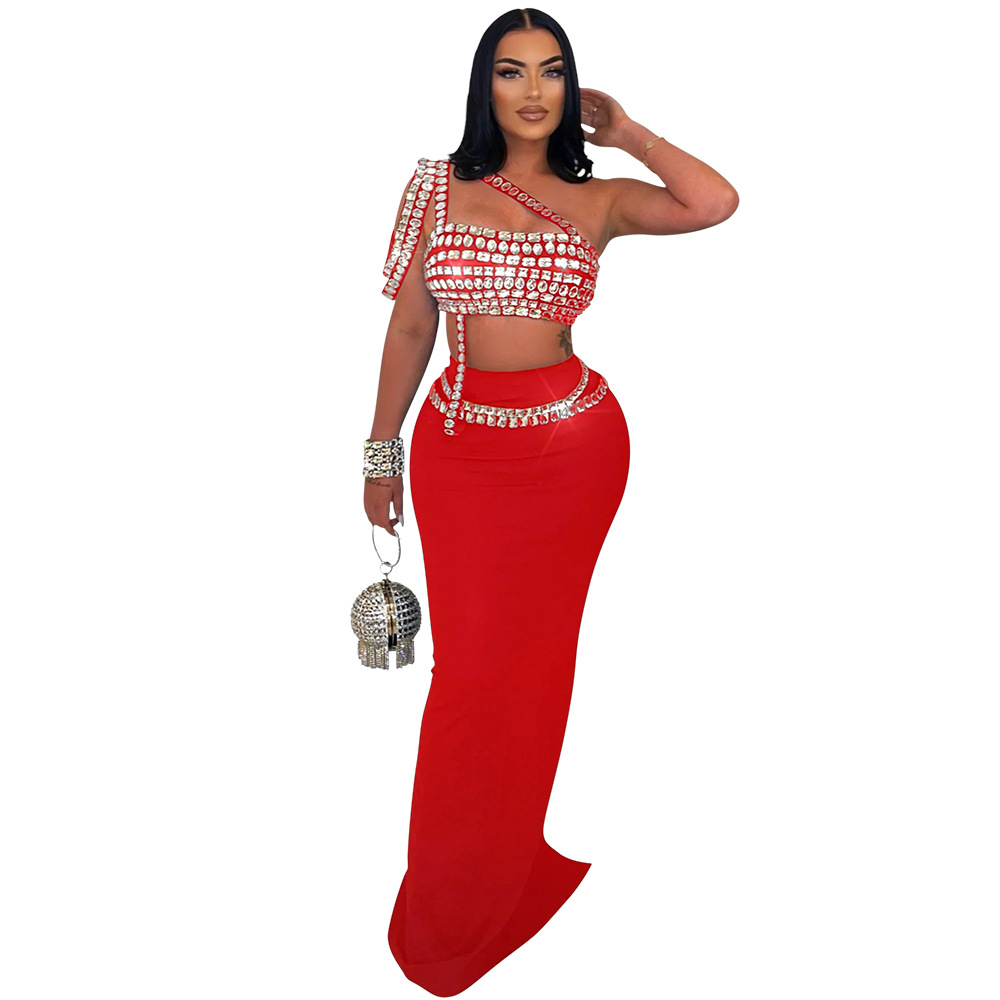 Draped Big Rhinestone Embellished Asymmetrical One Shoulder Crop Top+ Maxi Skirt Women's Formal 2-Piece Set