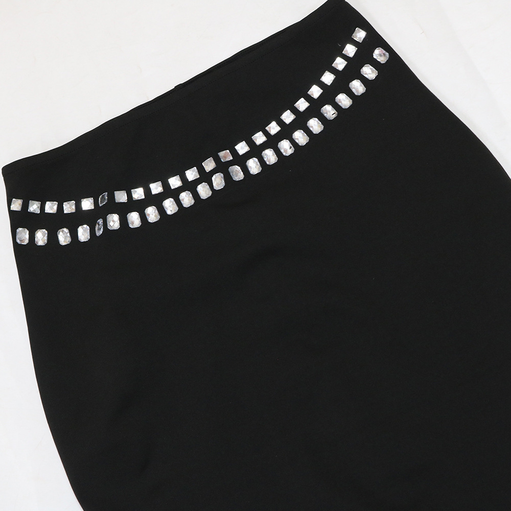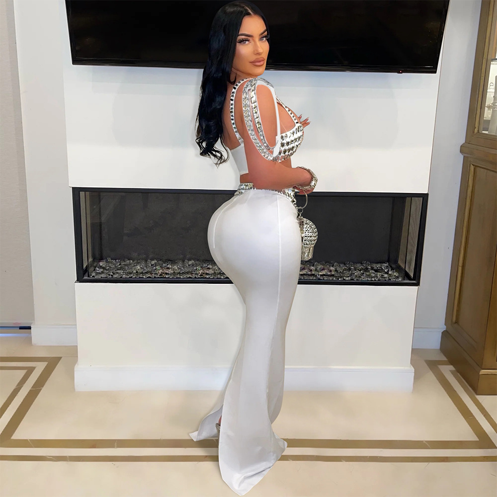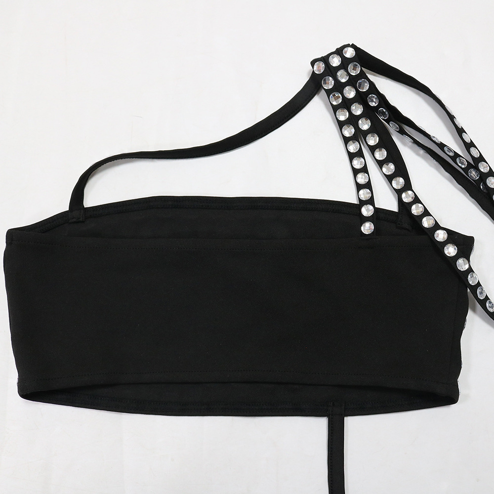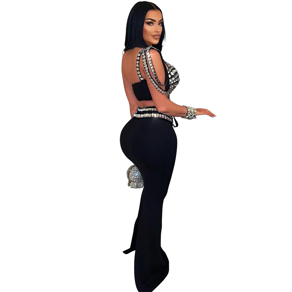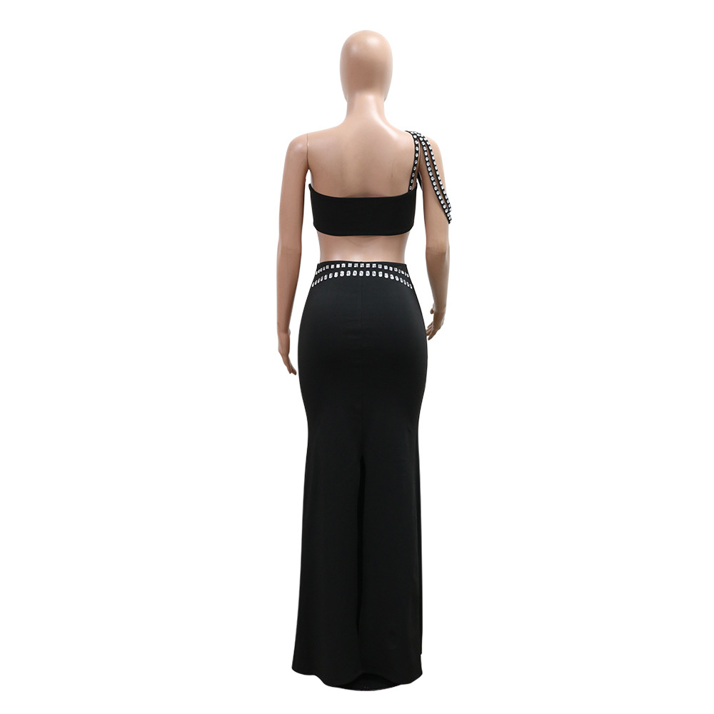Draped Big Rhinestone Embellished Asymmetrical One Shoulder Crop Top+ Maxi Skirt Women's Formal 2-Piece Set