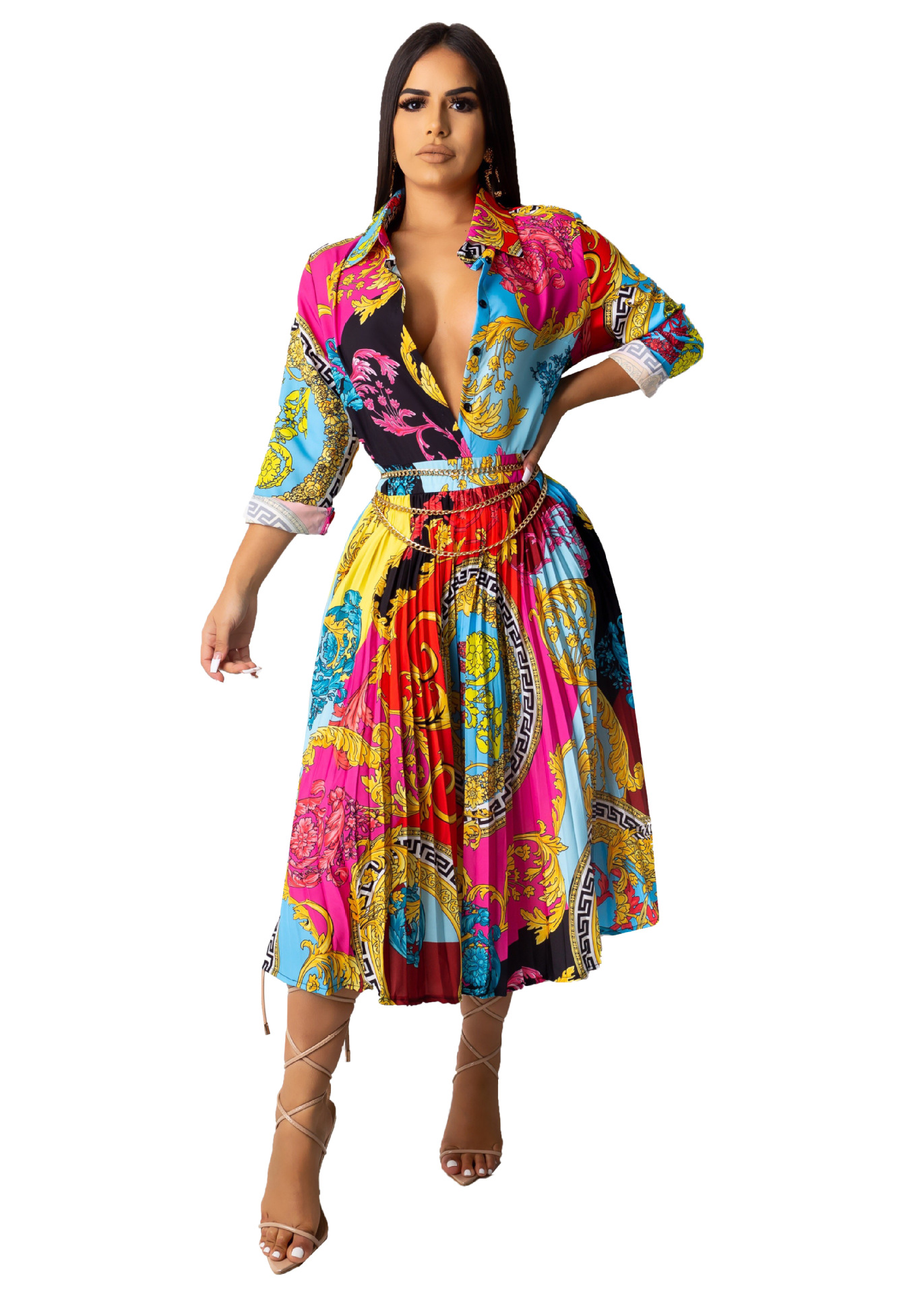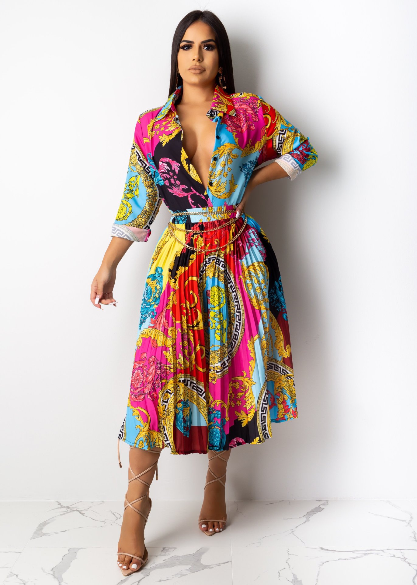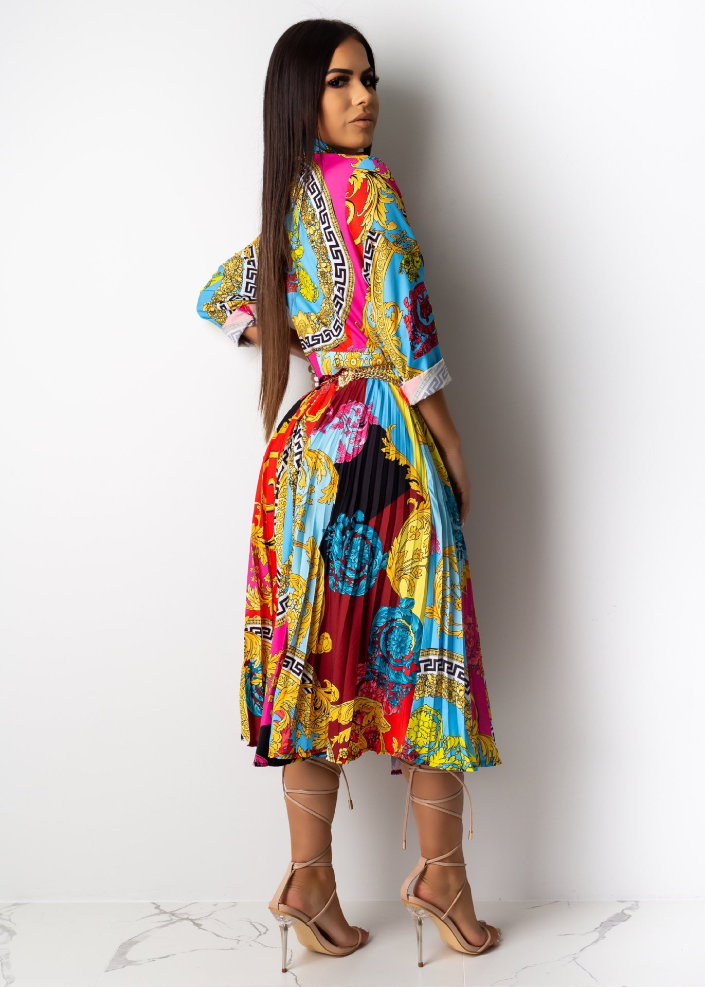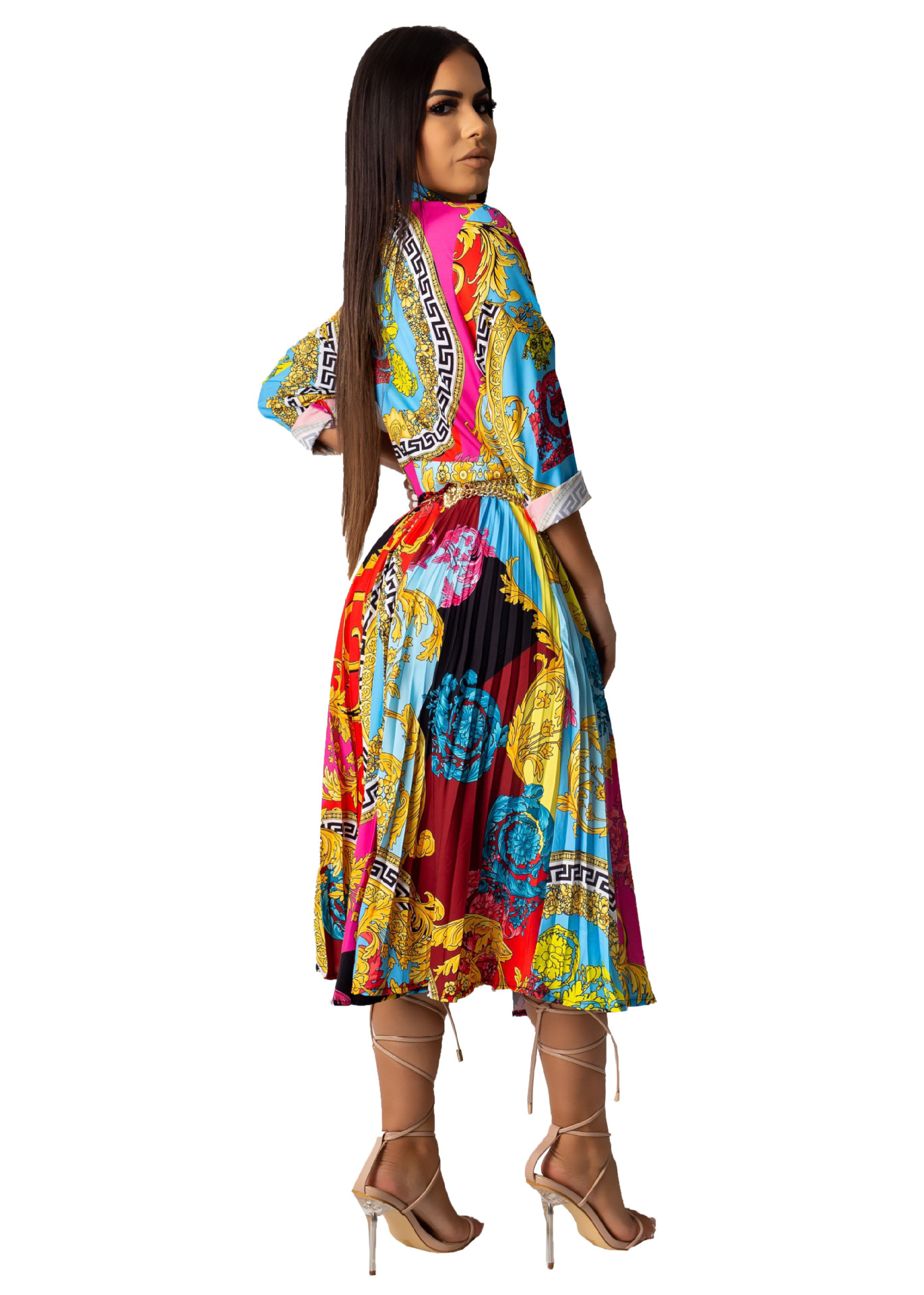 Pleated Baroque Multi-Colored Print Turn-Down Collar Long Sleeve Dress