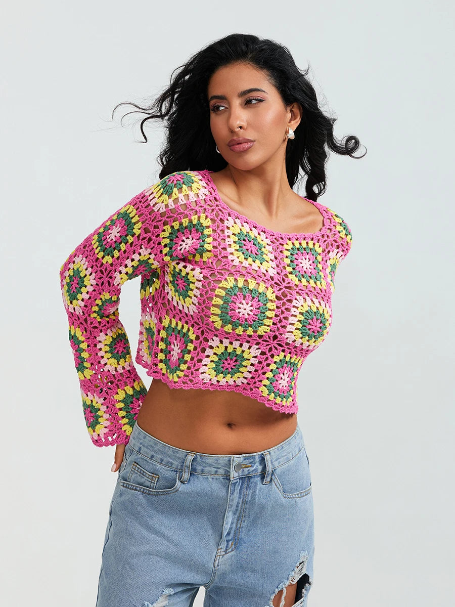 Crochet Square Floral Print Knitted Women’s Long Sleeve O-Neck Cropped Sweater