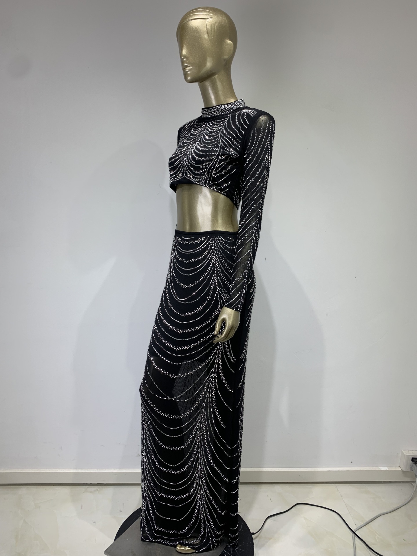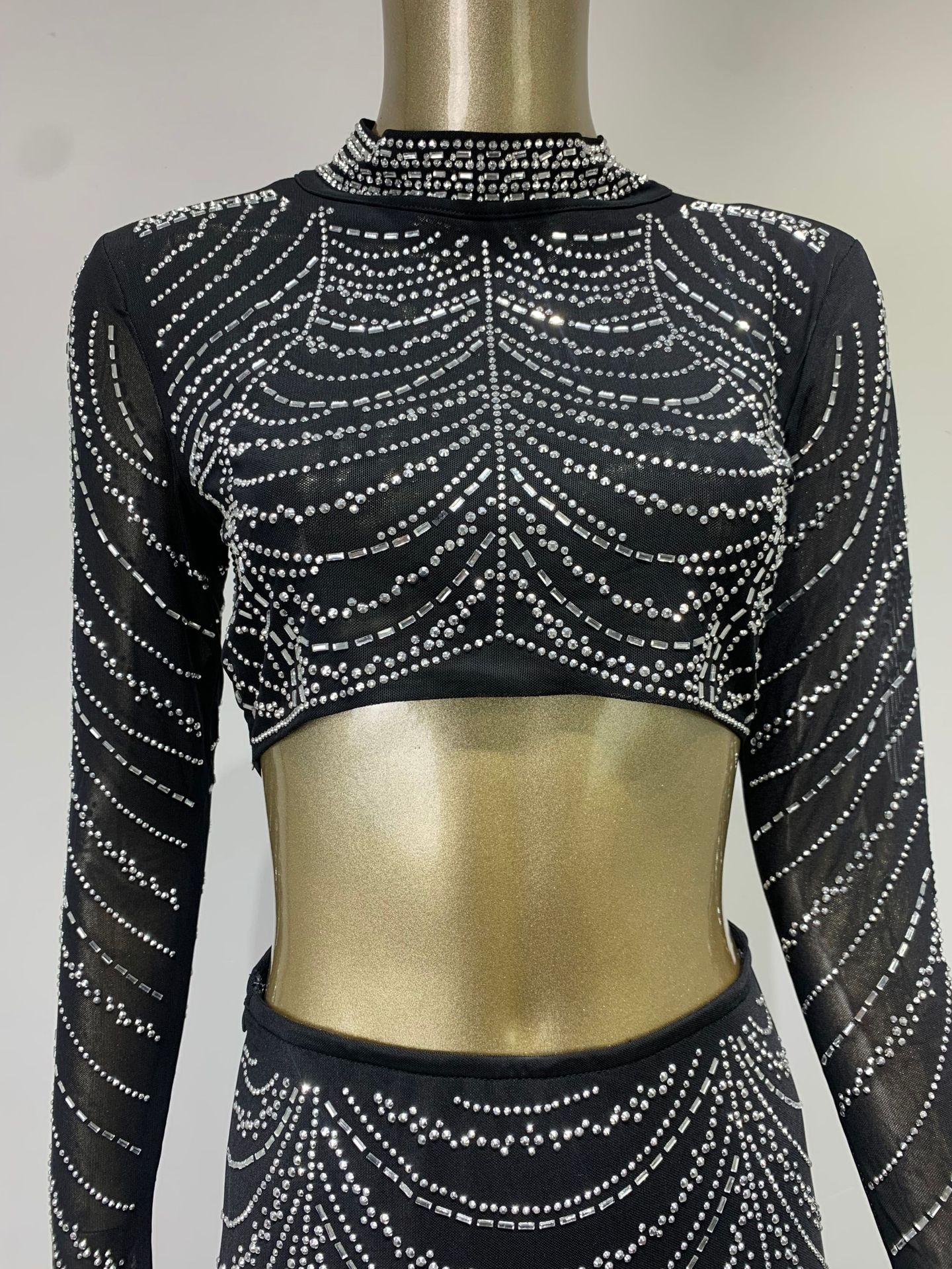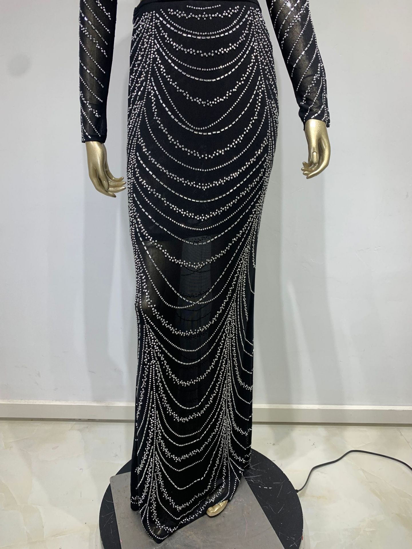 Black Sheer Metallic Transparent Tassel Women's Long Sleeve Rhinestone Crop Top + High Waist Maxi Skirt 2-Piece Set