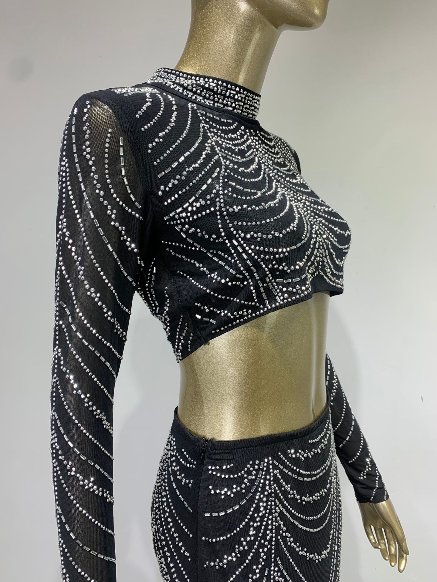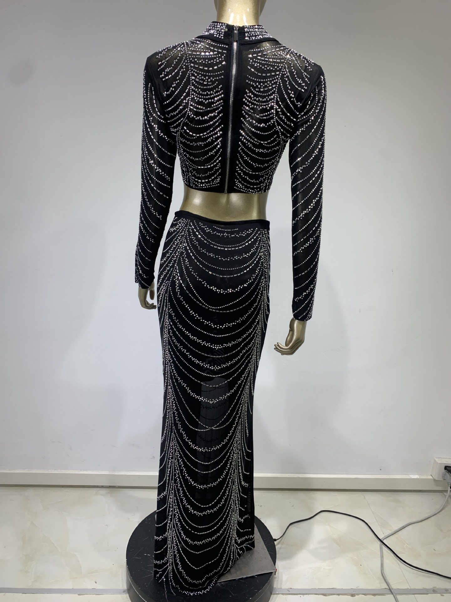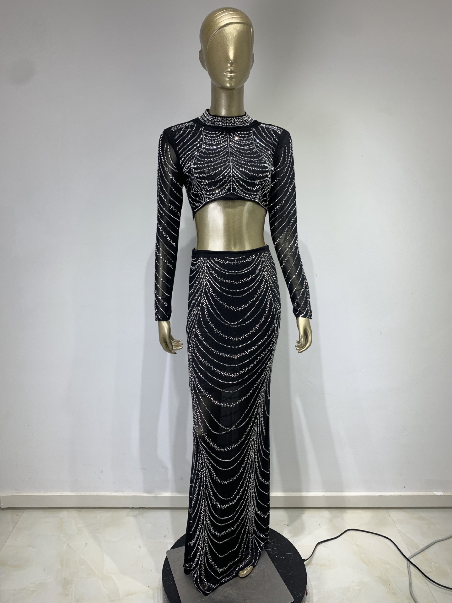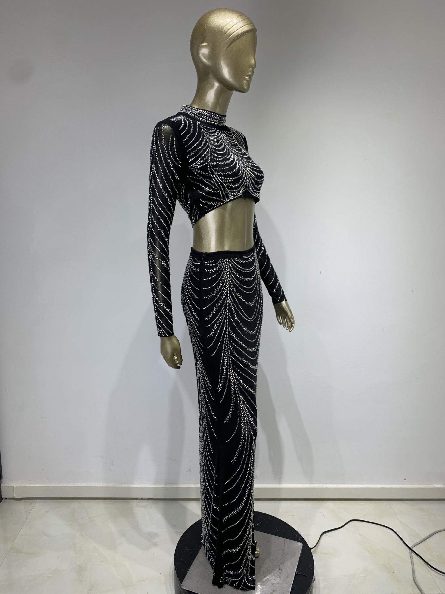 Black Sheer Metallic Transparent Tassel Women's Long Sleeve Rhinestone Crop Top + High Waist Maxi Skirt 2-Piece Set