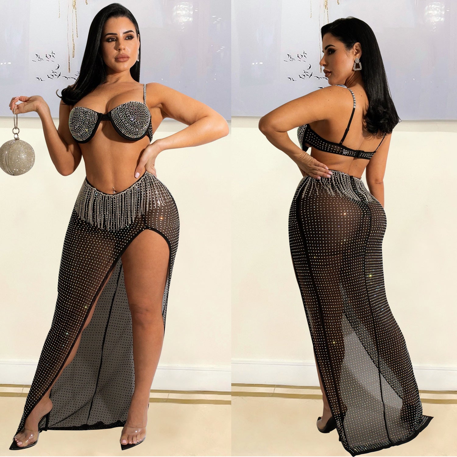 Metallic Silver/Black Mesh Rhinestone Bra + Tassel Fringe High Side Slit Maxi Skirt 2-Piece Set