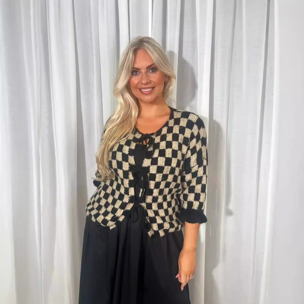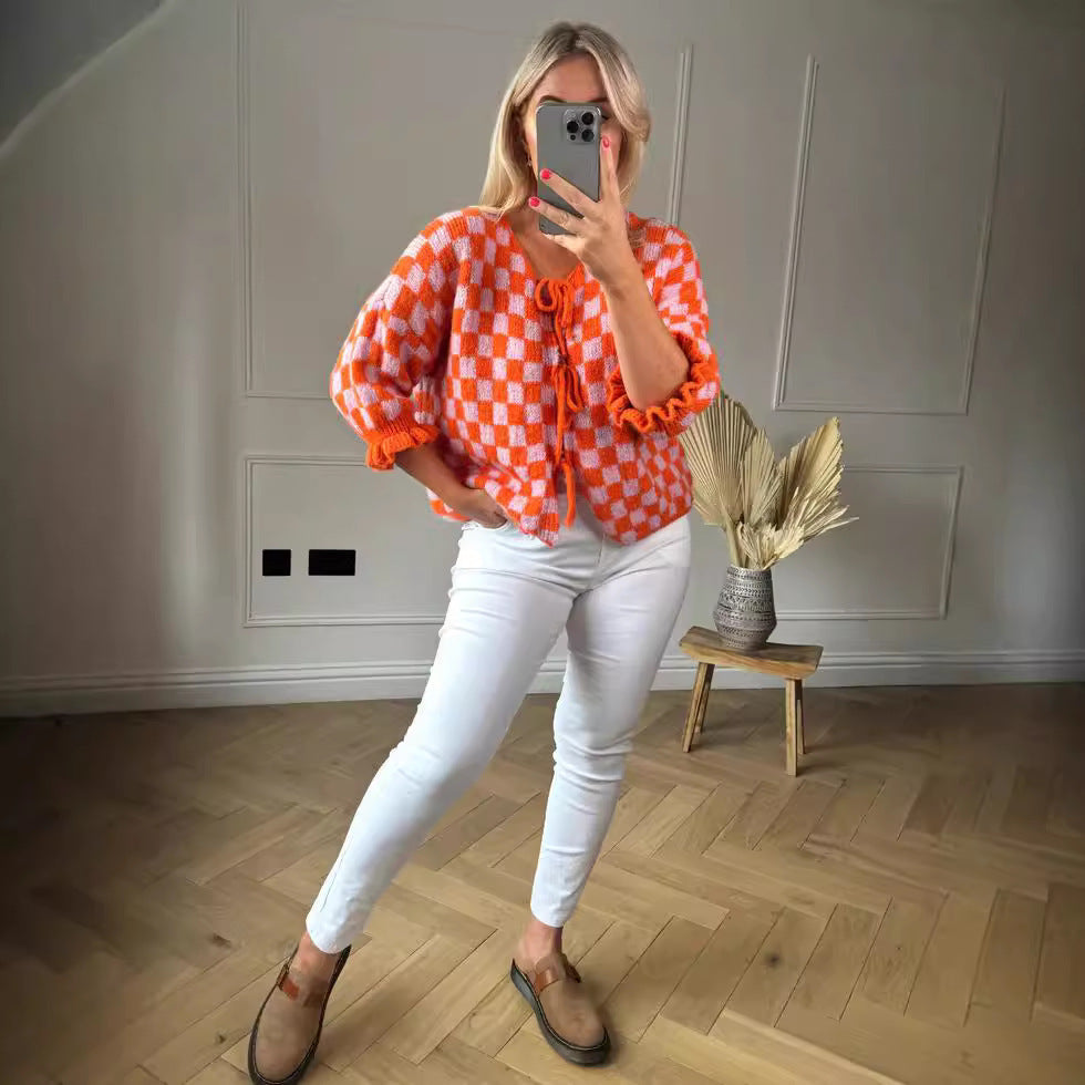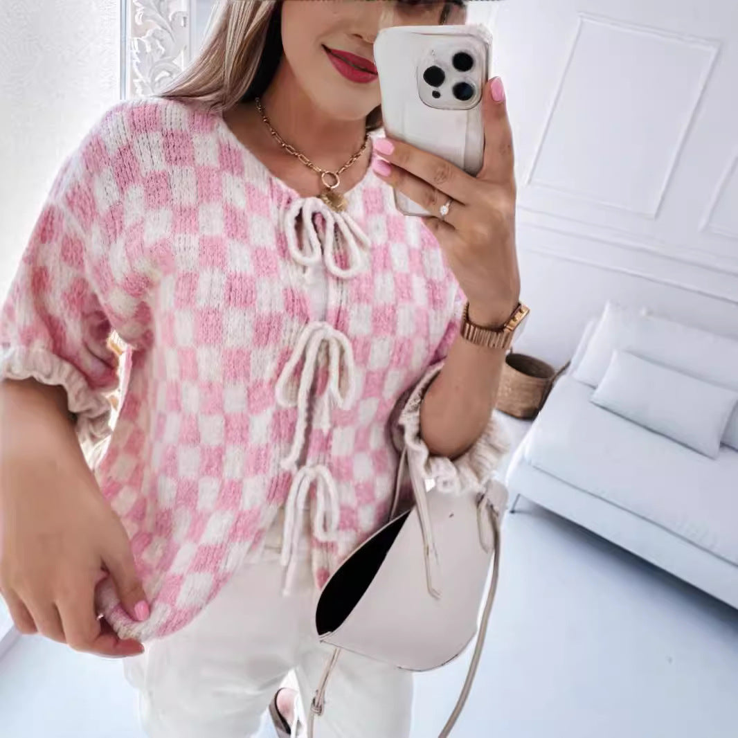 Plaid Checker Colorblock Print Bowknot Design Women's 1/2 Sleeve Sweater