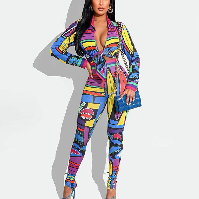 Tropical Printed Long Sleeve Women's Lace-Up Crop Top + Skin Tight Leggings 2-Piece Set