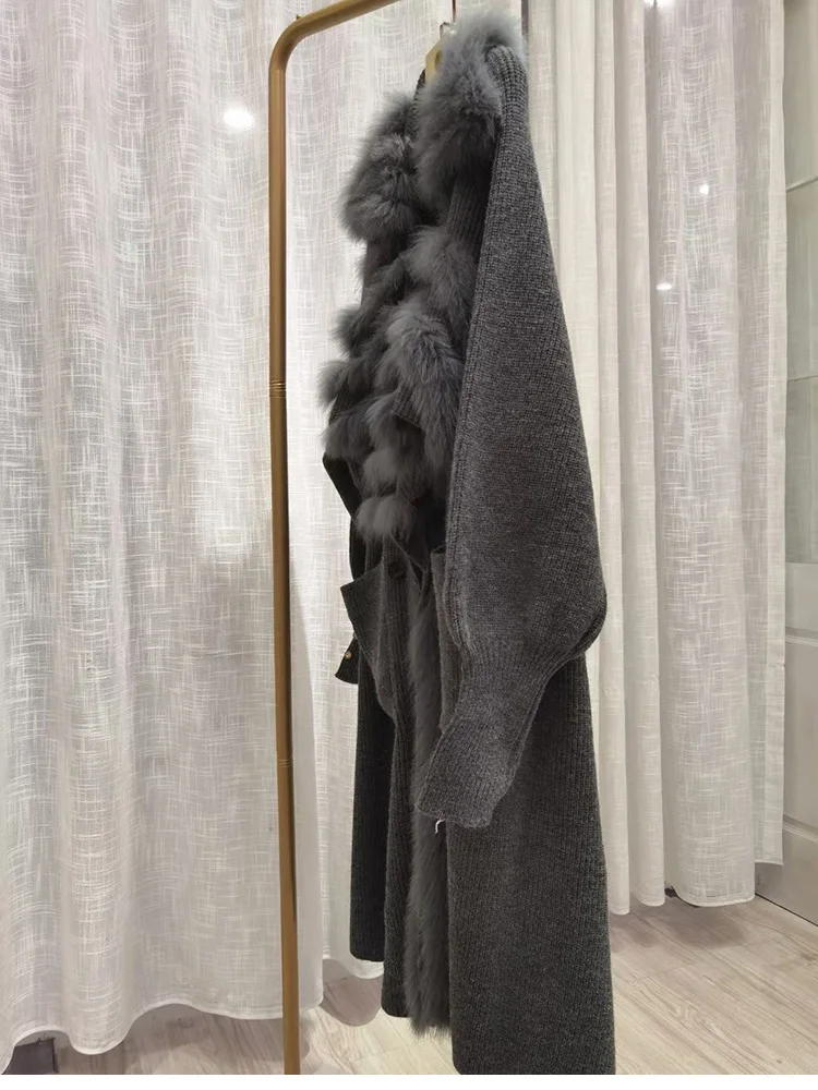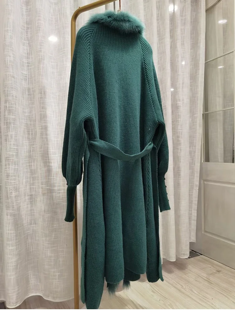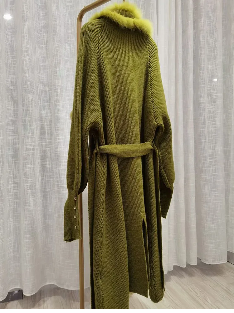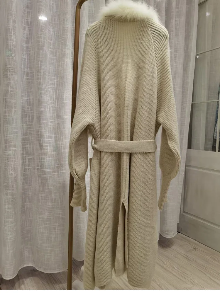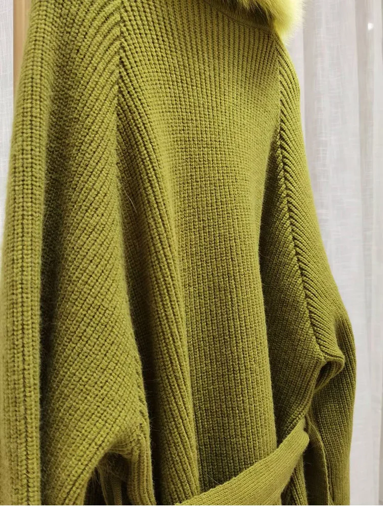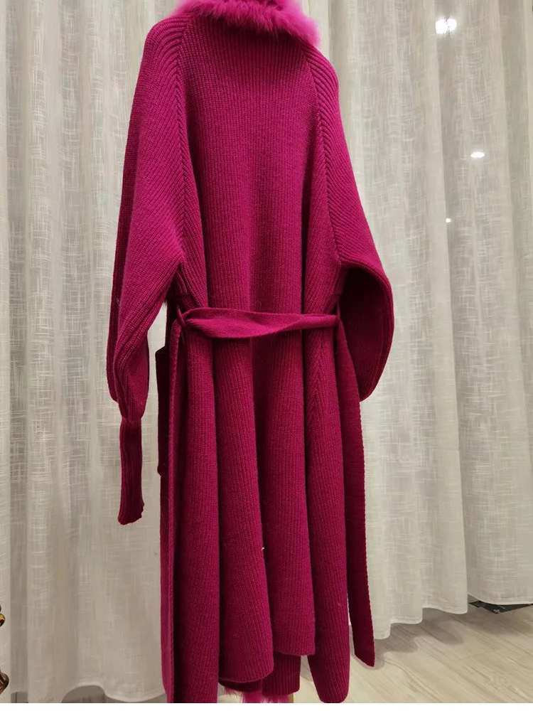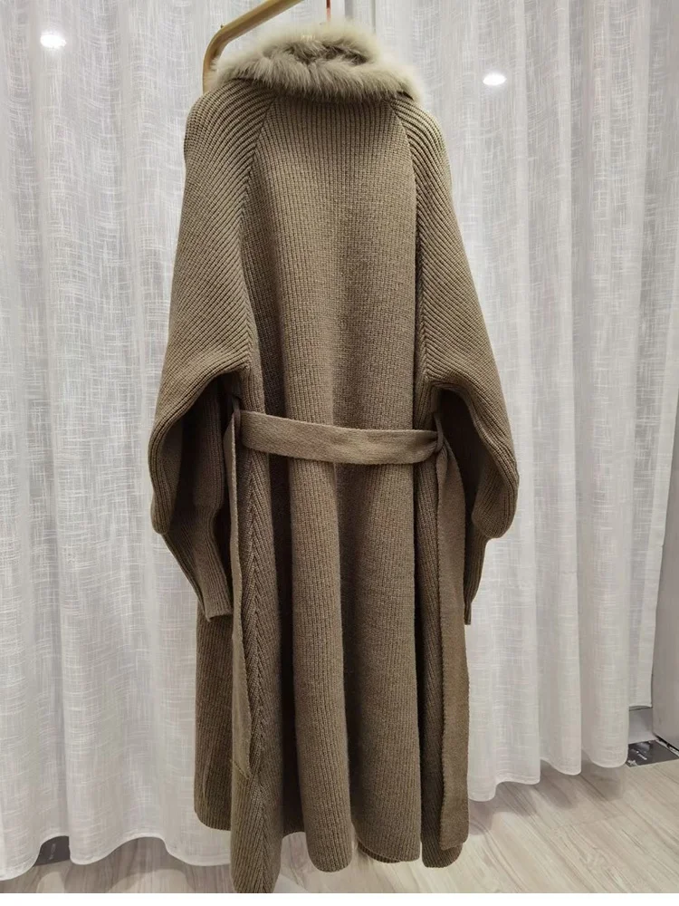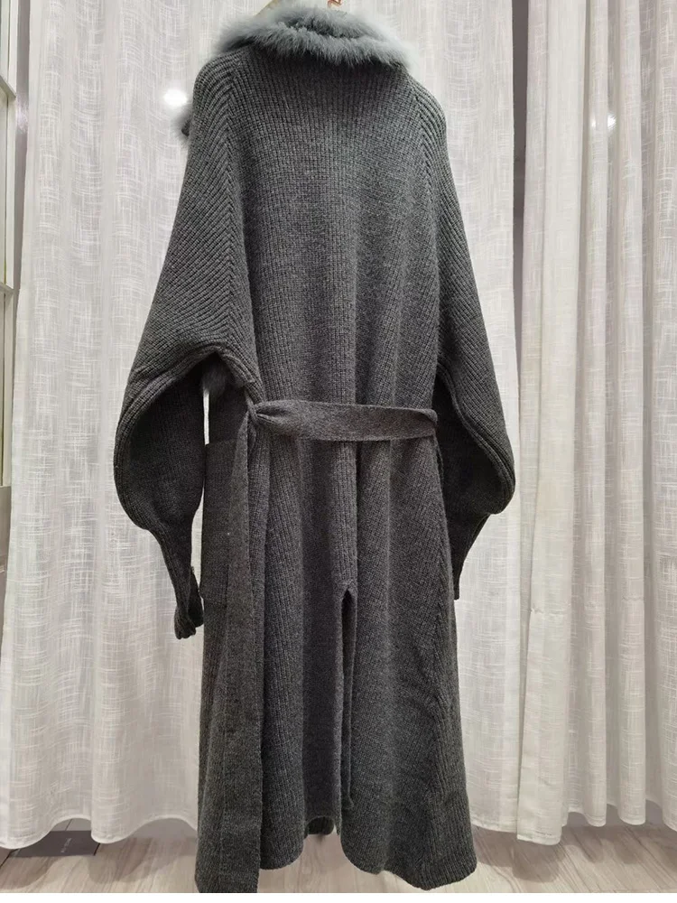Women's Real Fox Fur Collar Knitted Oversized Maxi Cardigan Sweater Trenchcoat w/ Belt